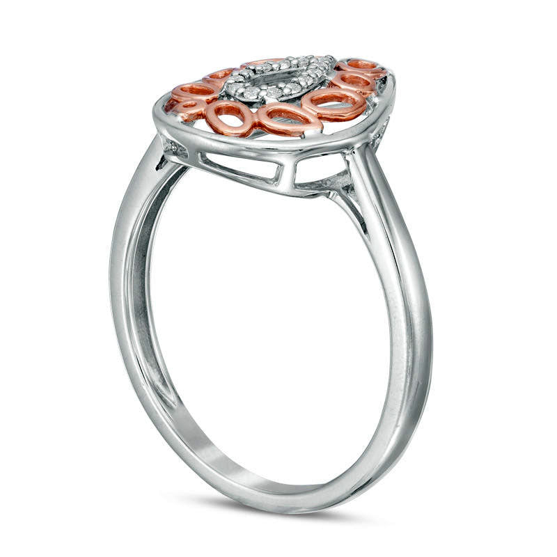 Looking for a touch of elegance to add to your professional wardrobe? Look no further than this breathtaking diamond teardrop ring. With its captivating design crafted from 10K two-toned gold, it features a diamond-lined white gold teardrop encircled by delicate polished rose gold ovals and circles. The outer ribbon frame in gleaming white gold completes the look, adding a touch of sophistication. With 1/20 ct. t.w. of diamonds and a brilliant shine, this ring is truly magnificent. Perfect for any occasion, it's sure to leave a lasting impression.