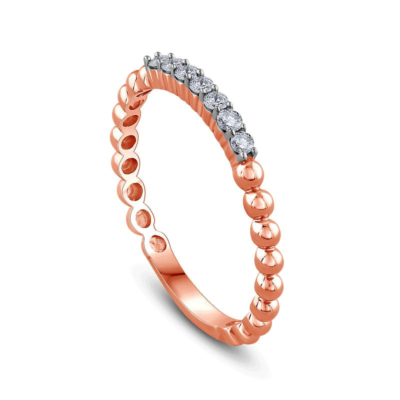Elevate your jewelry collection with the dazzling charm of this diamond stackable band. Crafted in elegant 10K rose gold, this band features a striking arrangement of seven diamonds at the center that shine brilliantly. The shank boasts a unique beaded design that adds a touch of depth and intrigue to the overall look. With a total diamond weight of 1/8 ct. and a high-quality polish, this ring exudes timeless elegance and sophistication. A definite must-have for any fashion-forward jewelry collector.