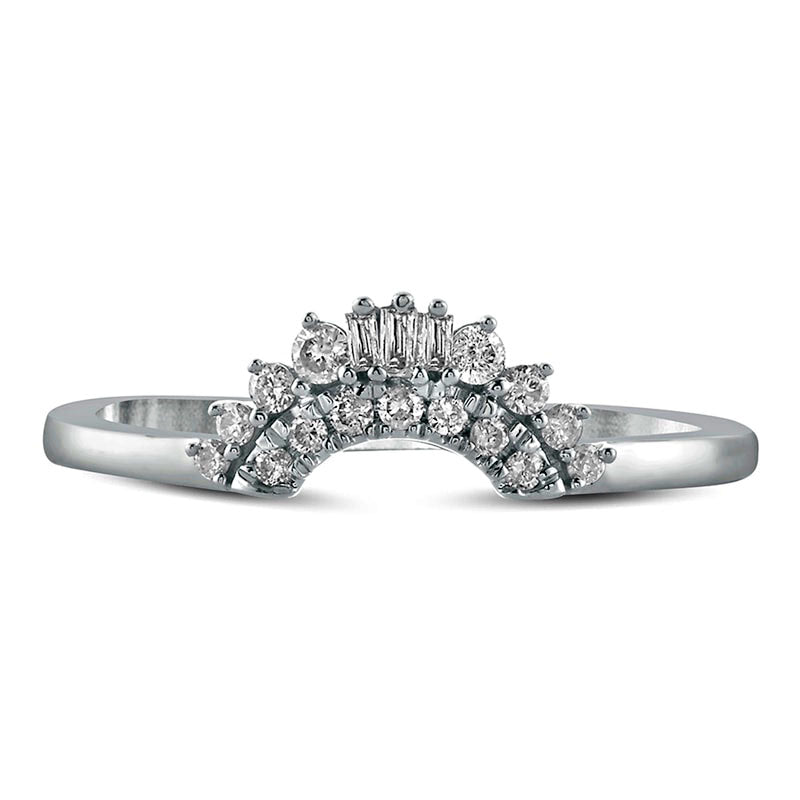 Express your eternal love with this exquisite diamond wedding band. Meticulously crafted from 10K white gold, this captivating piece showcases a gracefully curved contour adorned with a shimmering line of round diamonds. The outer edge is embellished with a stunning display of round and baguette-cut diamonds, creating a breathtaking radiance. With a total diamond weight of 1/6 ct. and a dazzling polished finish, this wedding band will undoubtedly become a cherished symbol of your everlasting commitment. Make your special day unforgettable with this stunning piece.