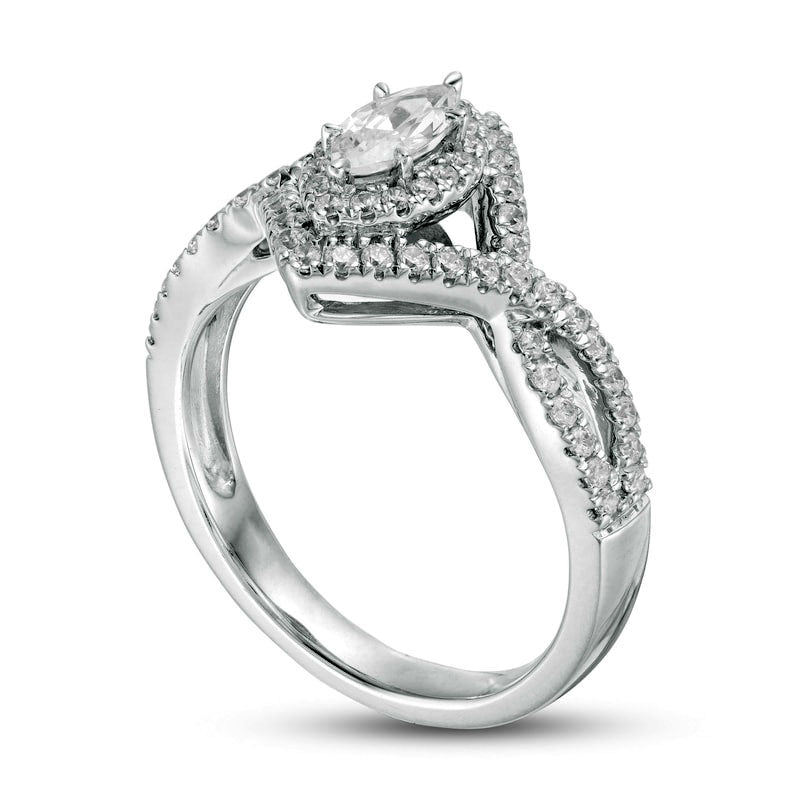 Experience the brilliance of true love with this stunning diamond engagement ring. Crafted in 14K white gold, this piece embodies modern elegance with a classic touch. A 1/3 ct. marquise-cut diamond is encircled by a halo of shimmering diamonds that adds to its radiance. The split shank is adorned with diamond-lined twist ribbons that elegantly wrap around the center, creating an open frame. This magnificent piece is a perfect symbol of your love, with a total weight of 3/4 ct. t.w. of diamonds and a dazzling polished luster that is sure to catch everyone's eye.