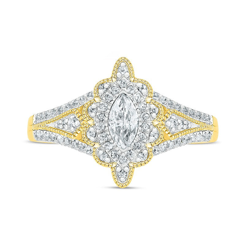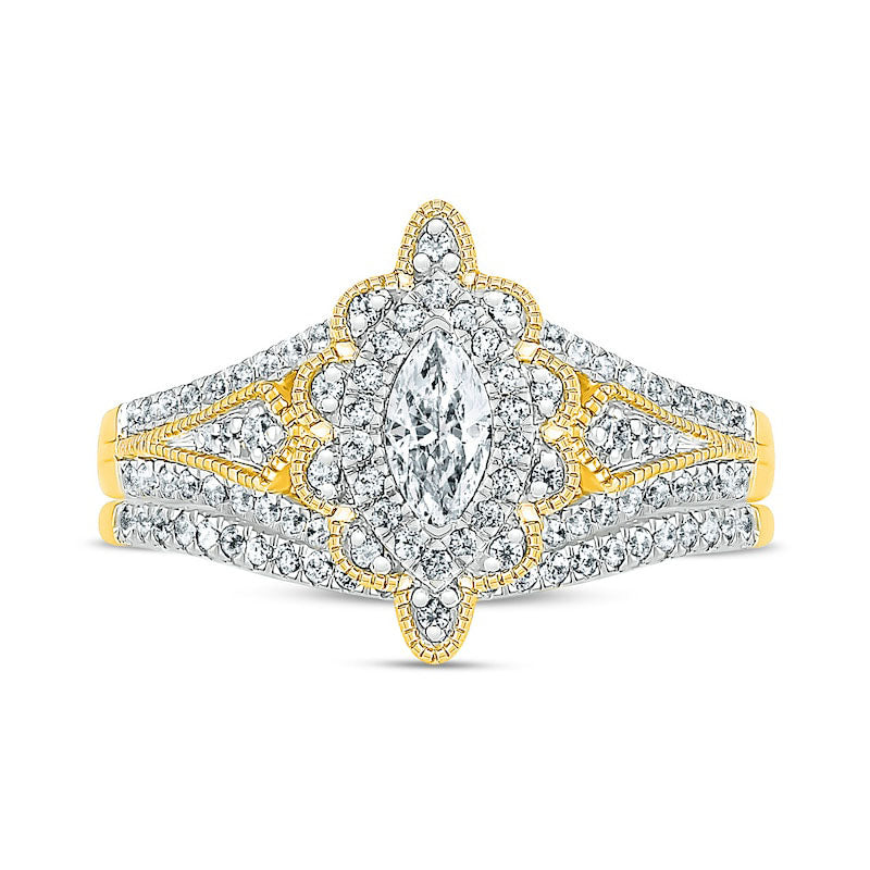 This stunning vintage-style diamond bridal set is the perfect way to show your love. Crafted in luxurious 10K gold, the engagement ring boasts a breathtaking 1/3 ct. marquise-cut diamond surrounded by a diamond halo and a diamond-encrusted scalloped frame with milgrain borders. The shank is embellished with diamond-lined borders and kite-shaped milgrain accents that gleam with diamonds. Accompanied by a coordinating diamond band, this set is packed with 3/4 ct. t.w. of diamonds, shining brilliantly and exuding a romantic charm. This bridal set will make your bride feel cherished and adored, with her radiance shining brighter than ever before.