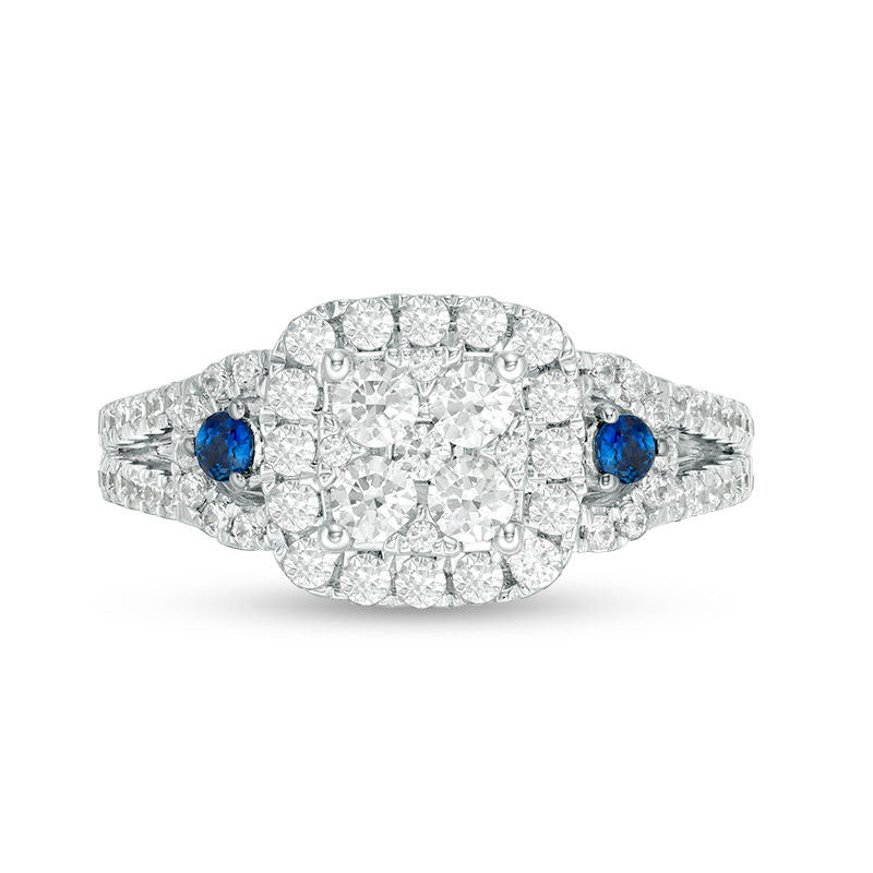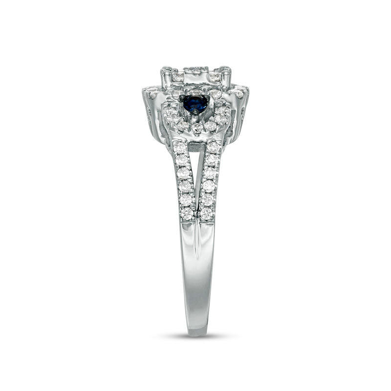 Indulge in a love story that will never fade with this captivating diamond and sapphire engagement ring. Created with exquisite 10K white gold, this stunning piece features an eye-catching square-shaped composite of four sparkling 1/15 ct. and smaller round diamonds, encircled by a dazzling diamond-lined frame. The open diamond-lined loop details on each side of the center design boast alluring 2.3mm bright blue sapphires, while the split shank dazzles with petite diamonds. This engagement ring is a masterpiece, boasting 7/8 ct. t.w. of diamonds and a brilliant buffed luster that will make her heart skip a beat. It's the perfect symbol of your love and devotion.