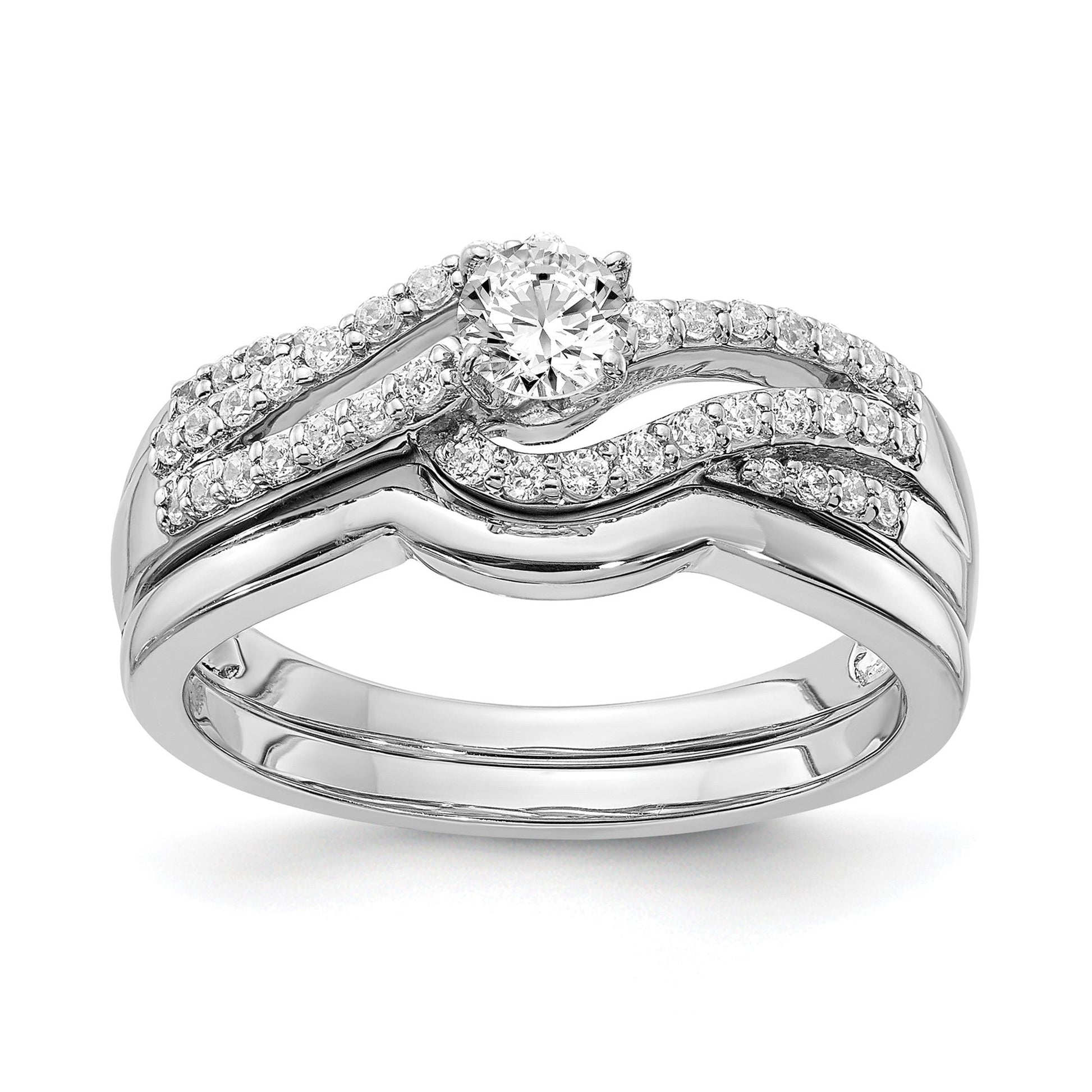 Beautifully framed in sparkling diamonds, a 1/2 ct. natural and earth mined round diamond commands attention in the lovely engagement ring of this bridal set. A single row of additional round diamonds line the 10K white gold band to complete the look. The matching wedding band showcases more round diamonds, bringing the total diamond weight of the bridal set to 1 carat.