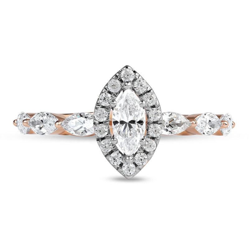 Propose to the love of your life with this stunning diamond engagement ring. Beautifully crafted from 10K rose gold, the centerpiece of this ring is a sparkling 1/3 ct. marquise-cut diamond, surrounded by a halo of round diamonds. The shank is also adorned with shimmering 1/10 ct. marquise-cut diamonds. This engagement ring features a total of 1 ct. t.w. of diamonds, making it truly dazzling. With its brilliant buffed luster, this ring will make any proposal moment magical and unforgettable.