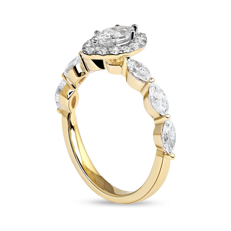 This exquisite diamond engagement ring is sure to make her heart skip a beat. Crafted in lustrous 10K gold, the centerpiece of this stunning design is a 1/3 ct. marquise-cut diamond that dazzles in a halo of round diamonds. The sleek shank features a line of shimmering 1/10 ct. marquise-cut diamonds that add a touch of glamour to the piece. With a total weight of 1 ct. t.w. of diamonds, this ring is a true symbol of your love and devotion. Give her a once-in-a-lifetime moment she'll never forget with this magical engagement ring that will surely take her breath away.