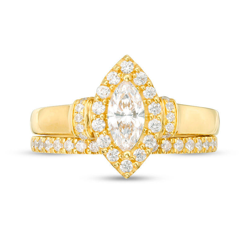 Get ready to make the love of your life feel like royalty with this stunning diamond bridal set. Crafted from 14K gold, the engagement ring boasts a dazzling 1/2 ct. marquise-shaped diamond at its center, surrounded by a halo of shimmering diamonds and complemented by diamond-lined collars on either side. For your big day, she can complete the picture-perfect look with the matching band, which sparkles with a row of diamonds. With a total diamond weight of 1 ct. and an impeccable shine, this bridal set will undoubtedly leave her breathless.