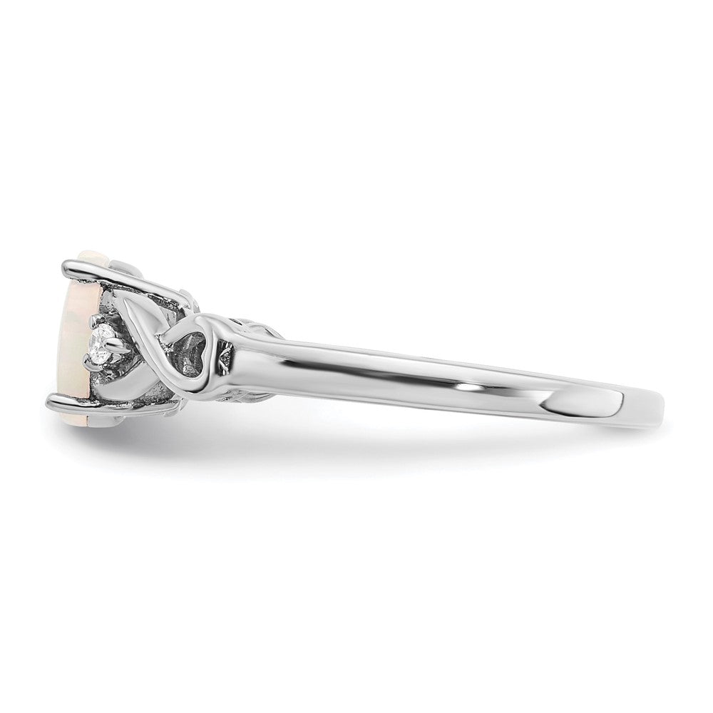 Introducing the exquisite 10K White Gold Created Opal and Diamond Ring, a stunning piece that exudes elegance. Crafted with pure 10K white gold, this ring showcases a polished rhodium finish that adds a touch of sophistication. The captivating opal is complemented by sparkling diamonds, creating a harmonious blend that catches the eye. Designed with a tapered band measuring 1.5 to 4.2 mm, it is both stylish and comfortable to wear. The ring is solid and expertly casted, ensuring durability. Available in sizes 6 to 8, this 10K White Gold Created Opal and Diamond Ring is a timeless treasure perfect for any occasion.
