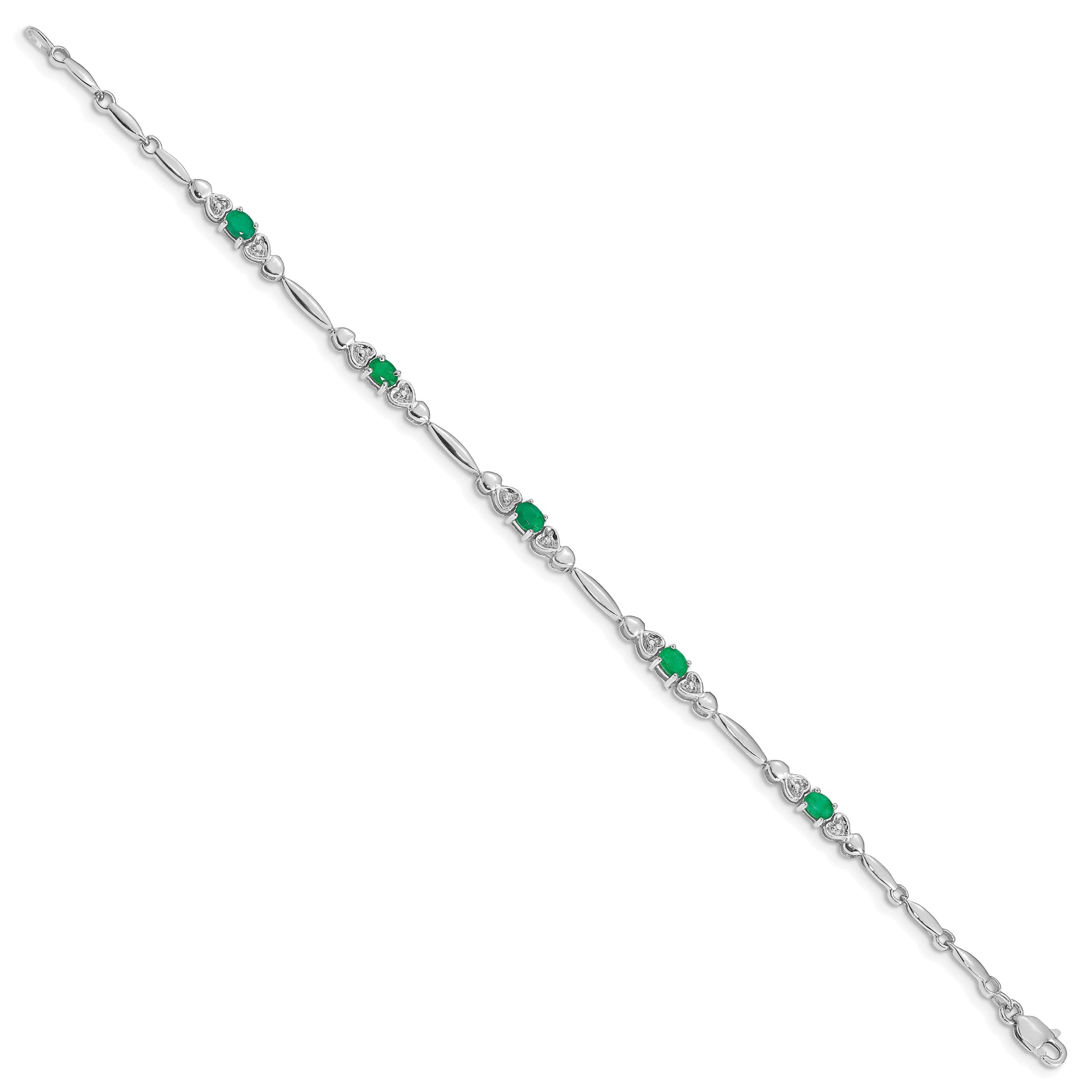 The 10K White Gold Diamond and Emerald Bracelet is a stunning piece of jewelry that exudes elegance and sophistication. Crafted from polished 10K white gold, this bracelet features natural emeralds and diamonds, adding a touch of sparkling brilliance to your wrist. With five vibrant green emeralds and two sparkling diamonds, the bracelet measures 7 inches in length and 4 mm in width. The oval-shaped emeralds weigh 0.22 carats while the round diamonds boast 0.005 carats. A rhodium plating finish and secure lobster clasp complete this exquisite piece, perfect for any occasion. Embrace grace and timeless charm with the 10K White Gold Diamond and Emerald Bracelet.