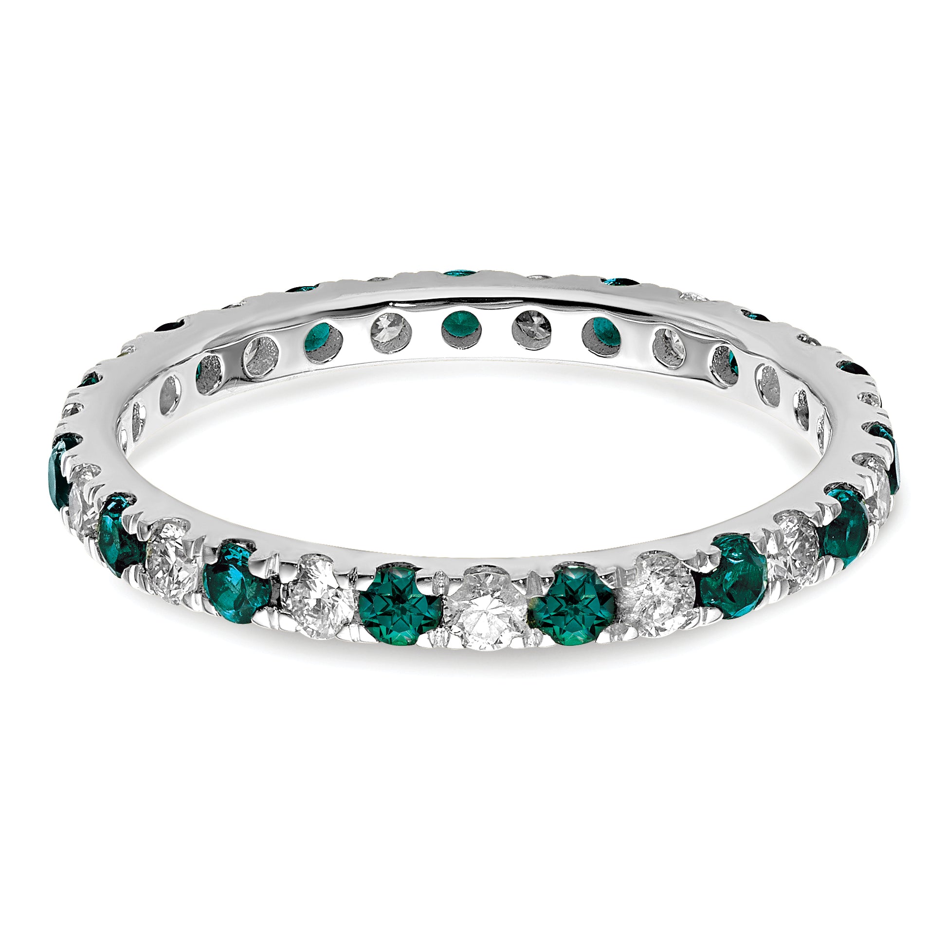The 14k White Gold 1/2 Ct. Lab Grown Diamond and Lab Created Alexandrite Eternity Band Ring is a fusion of sophistication and modern flair. Crafted with 14k white gold and a rhodium finish, this piece is polished to perfection. It showcases 16 lab-grown diamonds and 16 lab-created alexandrite stones, each round-cut for dazzling elegance. With a band width of 2.23mm, this solid ring isn't just an accessory—it's a statement. The VS/SI+ clarity ensures brilliance, while the captivating G+ color of the diamonds adds a touch of luxury. Highlight life's special moments with this timeless eternity band ring.