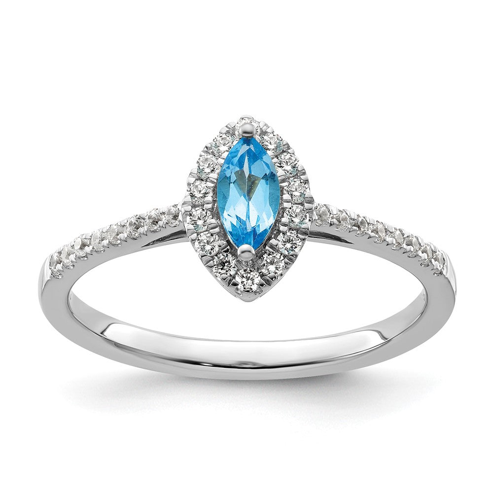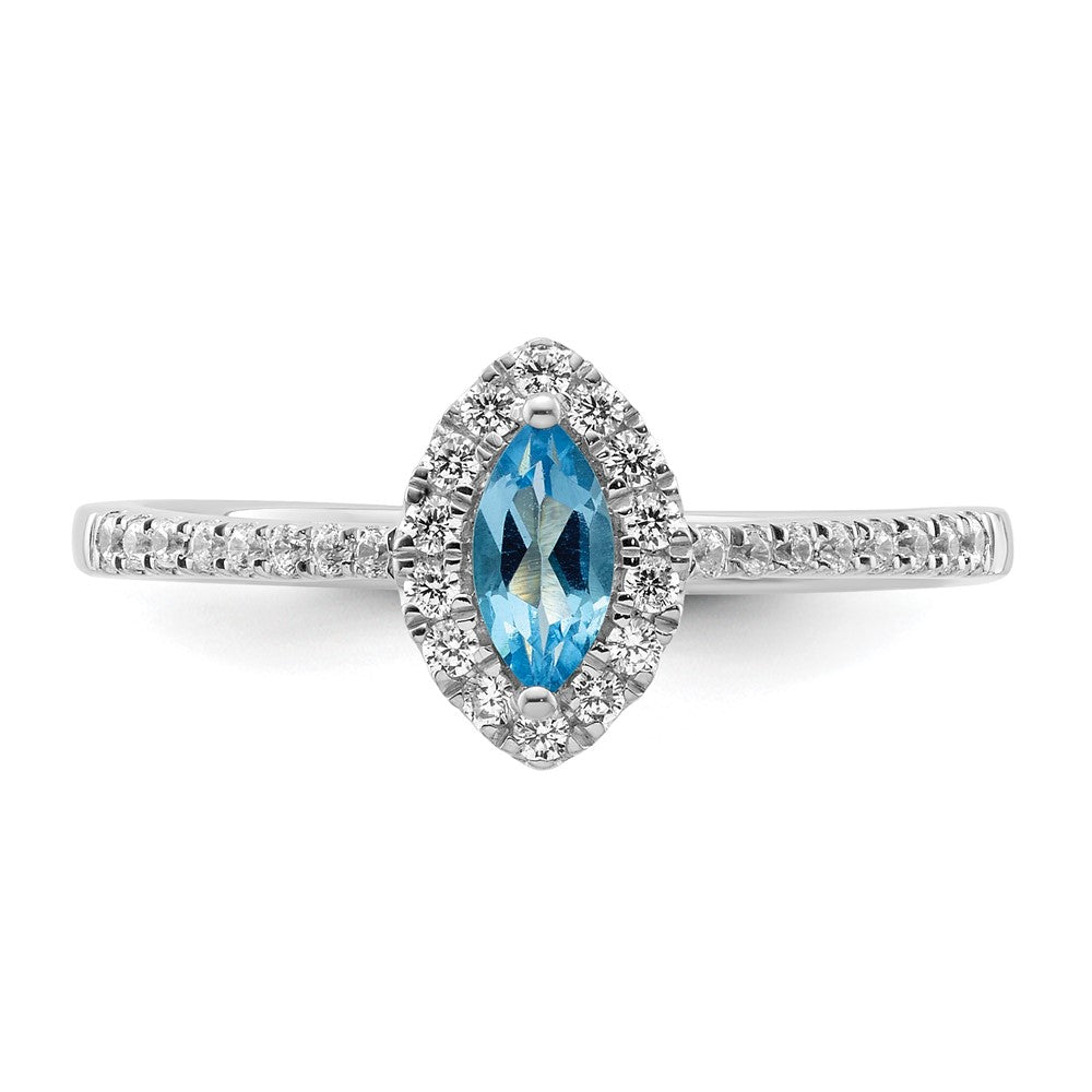 Celebrate December in style with the exquisite 14k White Gold 1/5 Ct. Lab Grown Diamond and Blue Topaz Birthstone Ring. Crafted to perfection, this ring boasts a gleaming marquise-cut Swiss blue topaz framed by sparkling lab-grown diamonds. The diamonds shine with VS/SI+ quality and a G+ color grade, ensuring an eye-catching brilliance. Set in polished 14k white gold, enhanced with a rhodium plating, this ring combines elegance with modern charm. With its open back design and rounded edges, it offer comfort without sacrificing style. The 14k White Gold 1/5 Ct. Lab Grown Diamond and Blue Topaz Birthstone Ring is the perfect gift for yourself or someone special. Embrace the beauty of December with this enchanting piece that's as unique as you are.