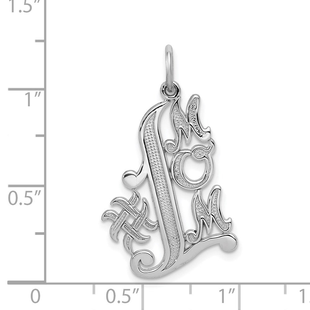 Introducing the stunning '14k White Gold #1 Mom Charm', a must-have addition to any jewelry collection. Crafted from high quality 14k white gold, this charm weighs 1.77 grams and boasts a sleek and elegant design. Measuring 28mm in length and 16mm in width, this piece showcases a brilliant rhodium plating for added luster and durability. This versatile charm can be added to any pendant or chain, making it perfect for daily wear or special occasions. Celebrate the love and beauty of motherhood with this exquisite and timeless charm.