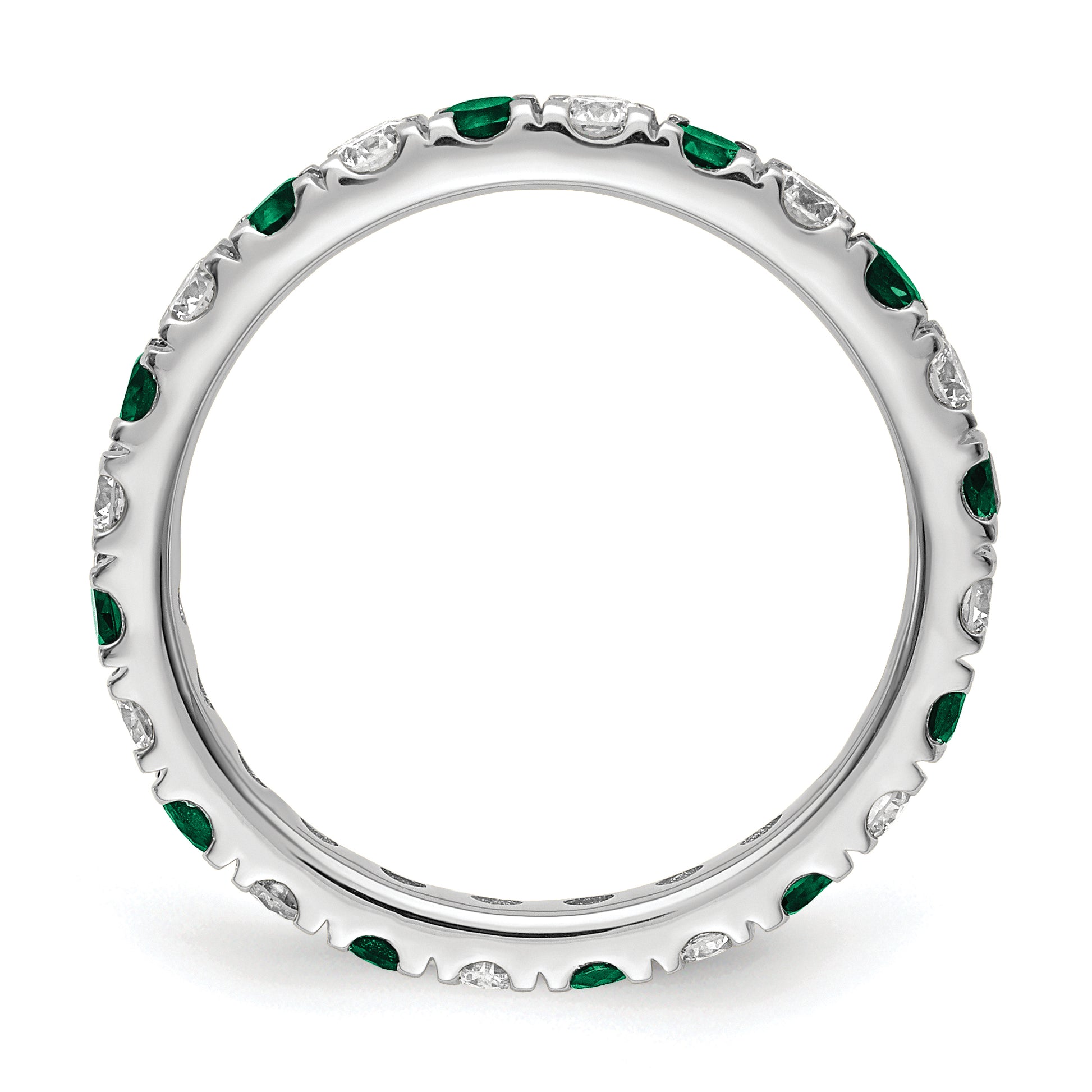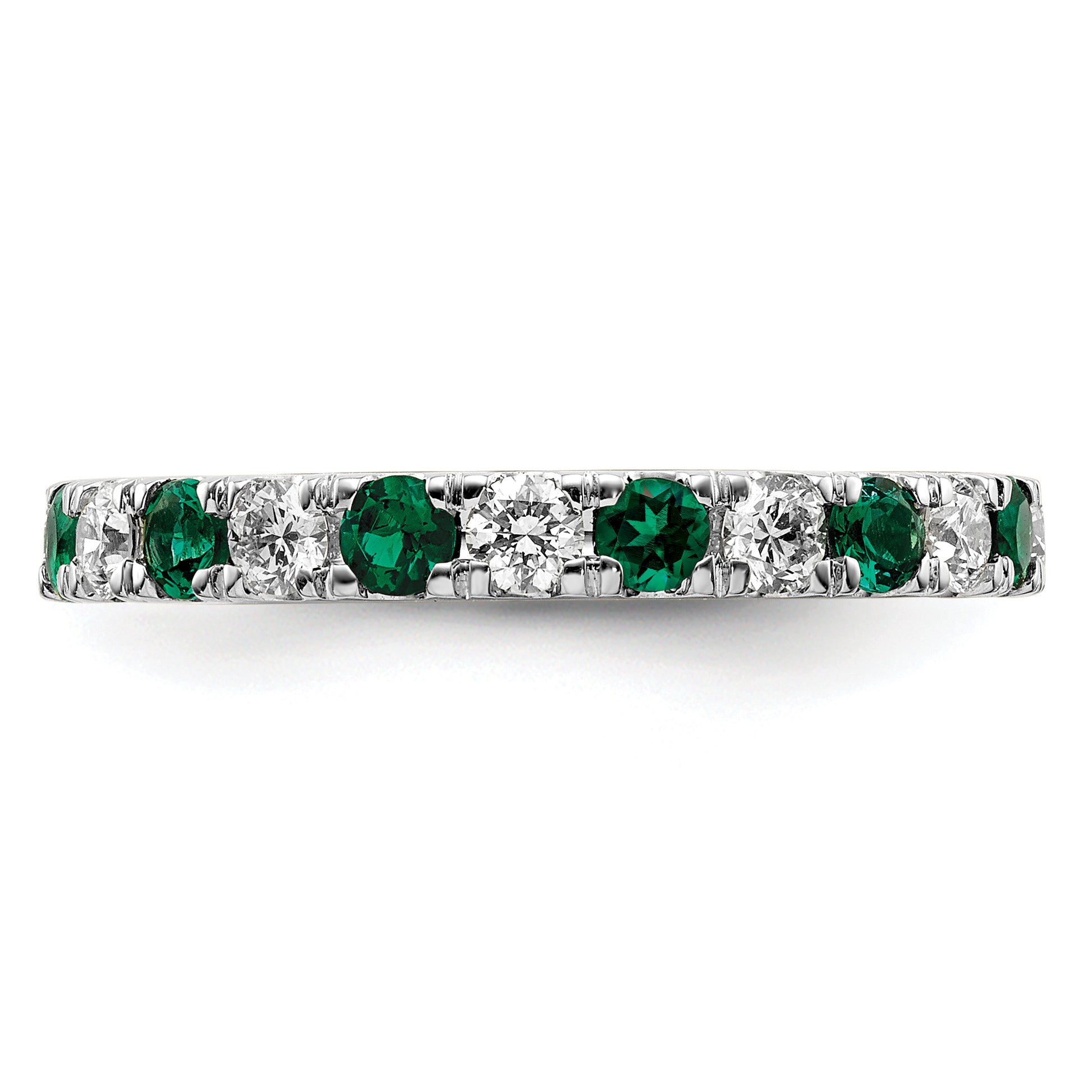 The 14k White Gold Eternity Band Ring is a stunning fusion of elegance and innovation. Crafted with precision, this exquisite piece features 13 lab-grown diamonds and 13 lab-created emeralds, each perfectly round at 2.5 mm. The diamonds boast a clarity of VS/SI+ and a captivating G+ color grade, while the emeralds shimmer with a vibrant green. With a polished finish and Rhodium plating, the ring's open-back profile enhances its allure. The 14k white gold band, measuring 2.65 mm, ensures durability and style for any occasion. This eternity band is an unforgettable statement of sophistication.