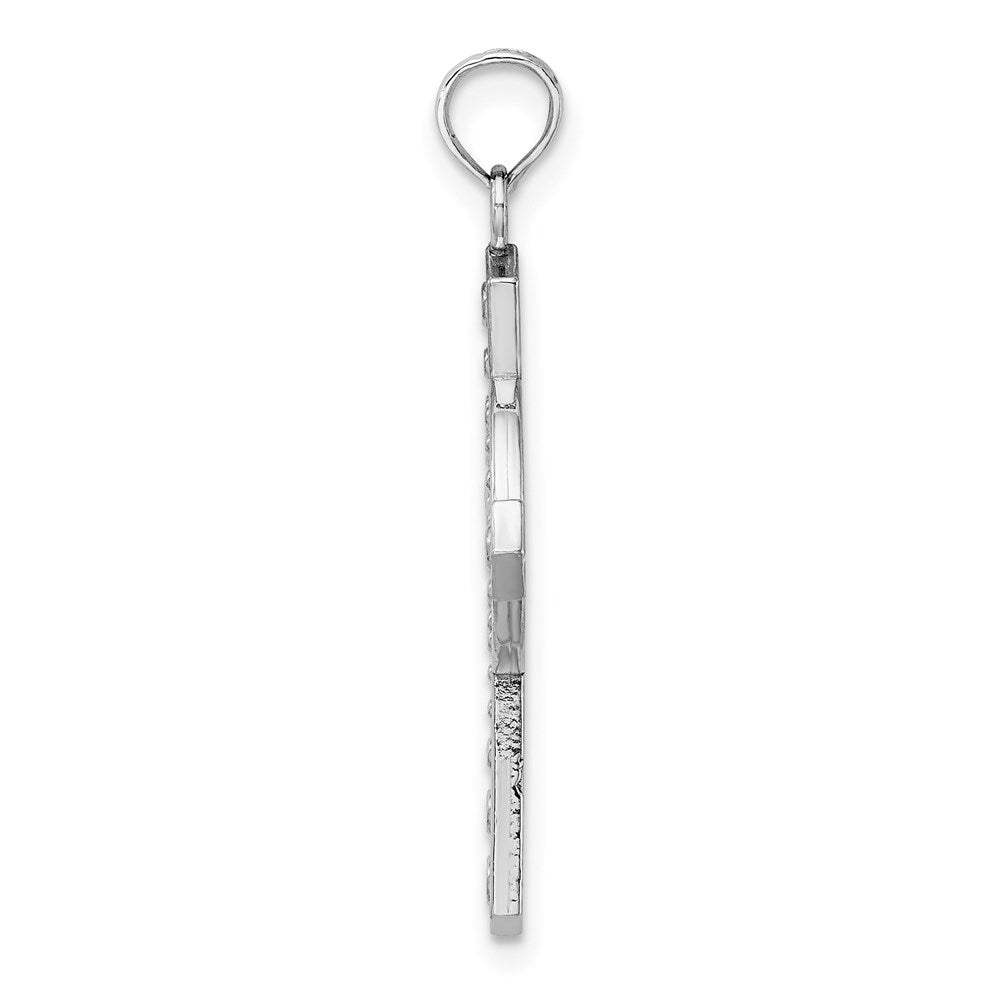 This stunning piece of jewelry is a 14k white gold beaded Celtic cross with an eternity charm. It weighs 1.38 grams and measures 29.3mm in length and 20mm in width, with a polished finish and rhodium plating. The charm element is 24.3mm in length and adorned with intricate beaded detailing. This pendant is created using a casting process and is sold individually. The bail measures 5mm in length and 4.5mm in width, adding to the overall beauty of the piece. It's a themed pendant that evokes a sense of timeless elegance and grace. The white gold color makes it a versatile piece that can complement any style, and it's sure to become a cherished addition to your jewelry collection.