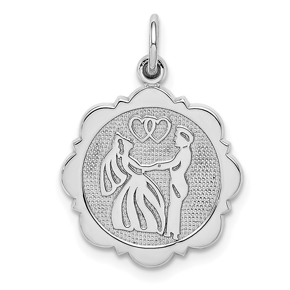 This is a charming bride and groom charm made of solid 14k white gold, weighing 1.51 grams. The charm is polished and measures 23mm in length and 16mm in width. It has a rhodium plating for added durability and is sold as an individual unit. Ideal as a pendant or a charm, this themed piece of jewelry is beautiful in its simplicity and elegance. Its white color complements any outfit and makes it a cherished addition to any jewelry collection.