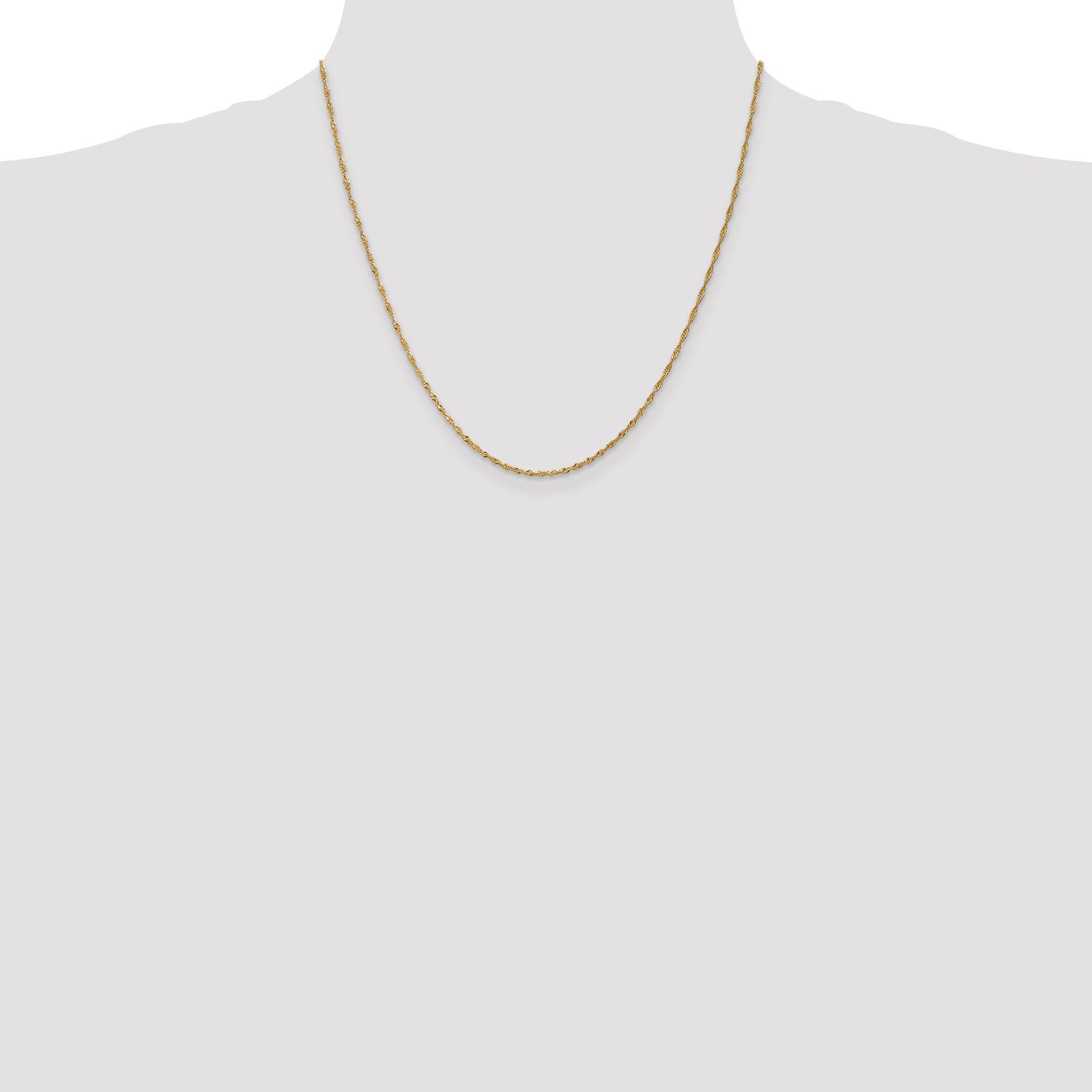 The 14K Yellow Gold 20-Inch 1.40mm Singapore Chain radiates elegance and sophistication. Its lustrous, polished finish showcases the rich, warm tone of 14K gold, making it a timeless addition to any jewelry collection. The chain boasts a graceful Singapore design, with intricate links that catch the light beautifully. At 20 inches in length and secured with a reliable spring ring clasp, this piece offers both versatility and style. Whether worn alone or layered with other pieces, the 14K Yellow Gold 20-Inch 1.40mm Singapore Chain defines understated luxury for women who appreciate fine craftsmanship.