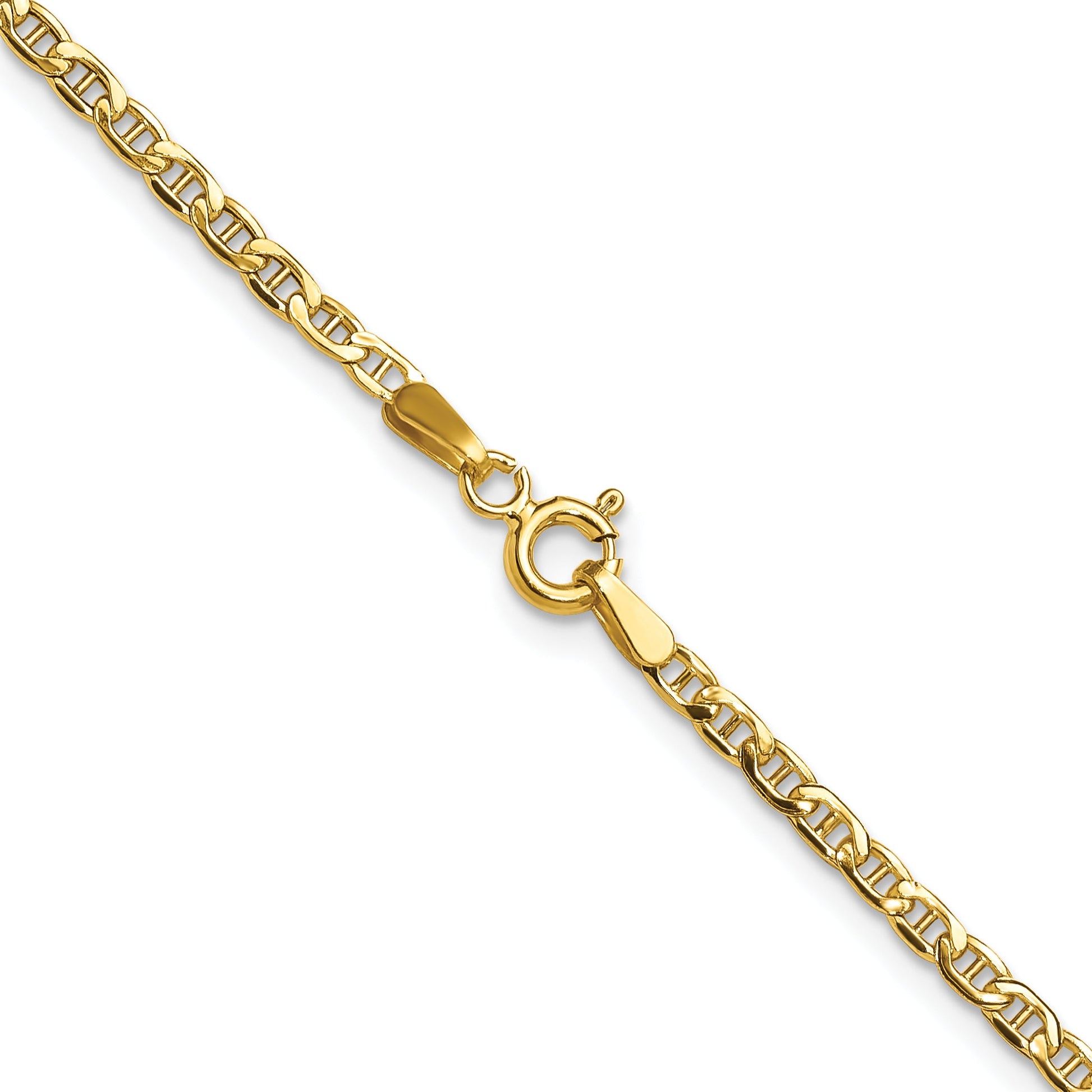 The 14K Yellow Gold 2.4mm Semi-Solid Anchor Chain is a stylish and durable jewelry piece worth your attention. Crafted from high-quality 14K gold, this necklace features a shiny polished finish. It measures 24 inches long and has a sturdy 2.4mm-width anchor chain that sits comfortably around your neck. The spring ring clasp ensures secure wear, and the chain's semi-solid design offers just the right balance of strength and flexibility. Perfect for daily wear or layering, the 14K Yellow Gold 2.4mm Semi-Solid Anchor Chain adds classic shine to any look.