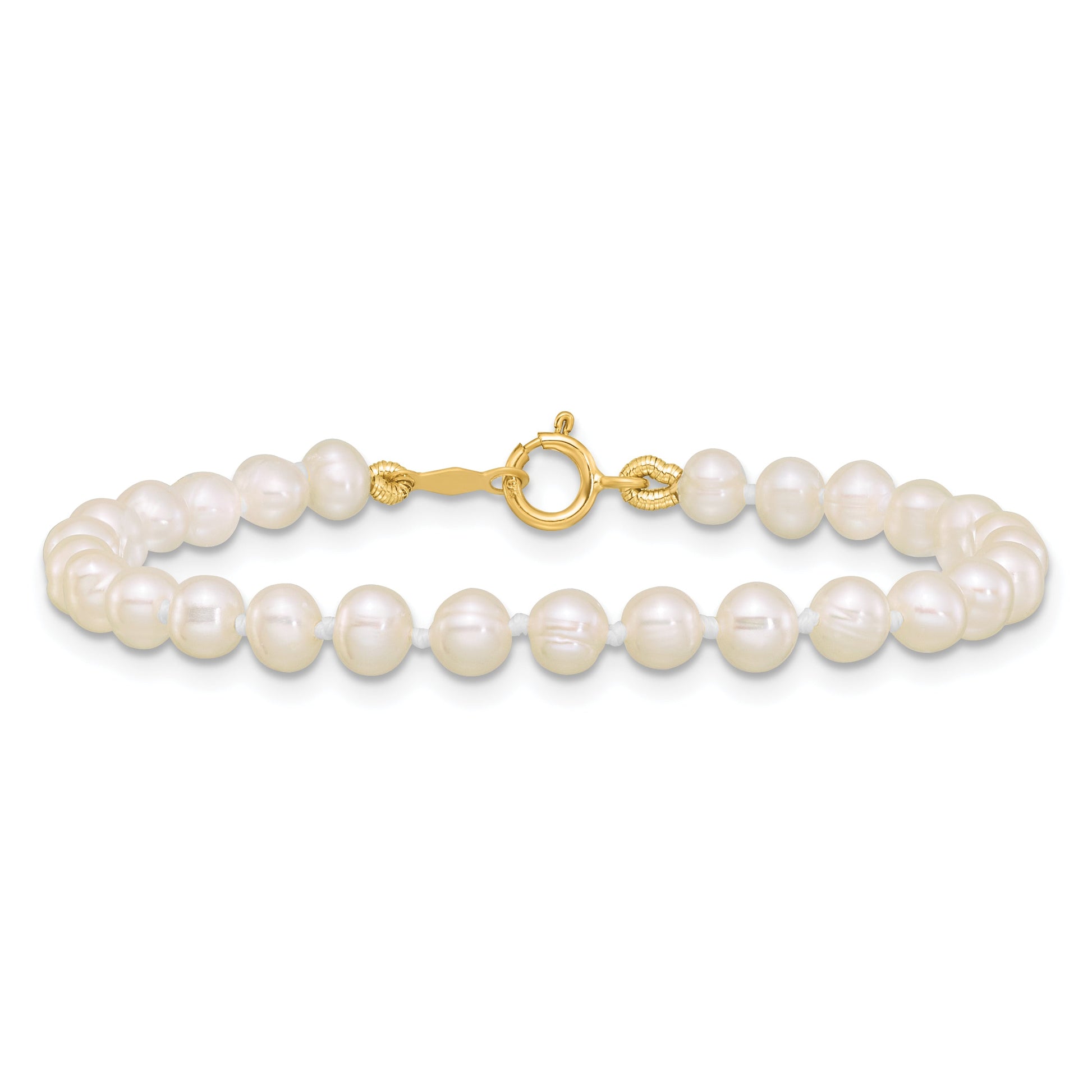 Introducing the 14K Yellow Gold 3-4mm White Semi-Round Freshwater Cultured Pearl 4 Inch Bracelet, a perfect piece to elevate your style. Crafted from polished 14K gold, this bracelet features shimmering white freshwater pearls with a near-round shape, each measuring 3 to 4 mm. The hollow design adds lightweight comfort, while the spring ring clasp ensures a secure fit. Ideal for girls who love classic elegance, this freshwater pearl bracelet combines quality and charm. The 4-inch length makes it a versatile accessory for any outfit. The 14K Yellow Gold 3-4mm White Semi-Round Freshwater Cultured Pearl 4 Inch Bracelet is an elegant jewelry piece that balances sparkle and sophistication.