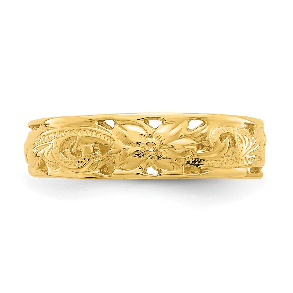 The "14k Yellow Gold Adjustable Flower w/ Leaf Trim Toe Ring" is a stunning piece of jewelry made with high-quality precious metal. Crafted with 14k yellow gold, the toe ring weighs 1.36 grams and features a polished finish. Its unique design includes an adjustable flower with leaf trim, making it a versatile addition to any jewelry collection. This toe ring is sold individually and is perfect for adding a touch of luxury to any outfit. Its gleaming yellow gold color adds a touch of elegance, making it an ideal gift for someone special or a treat for yourself. Invest in this beautiful gold toe ring for a timeless and sophisticated look.