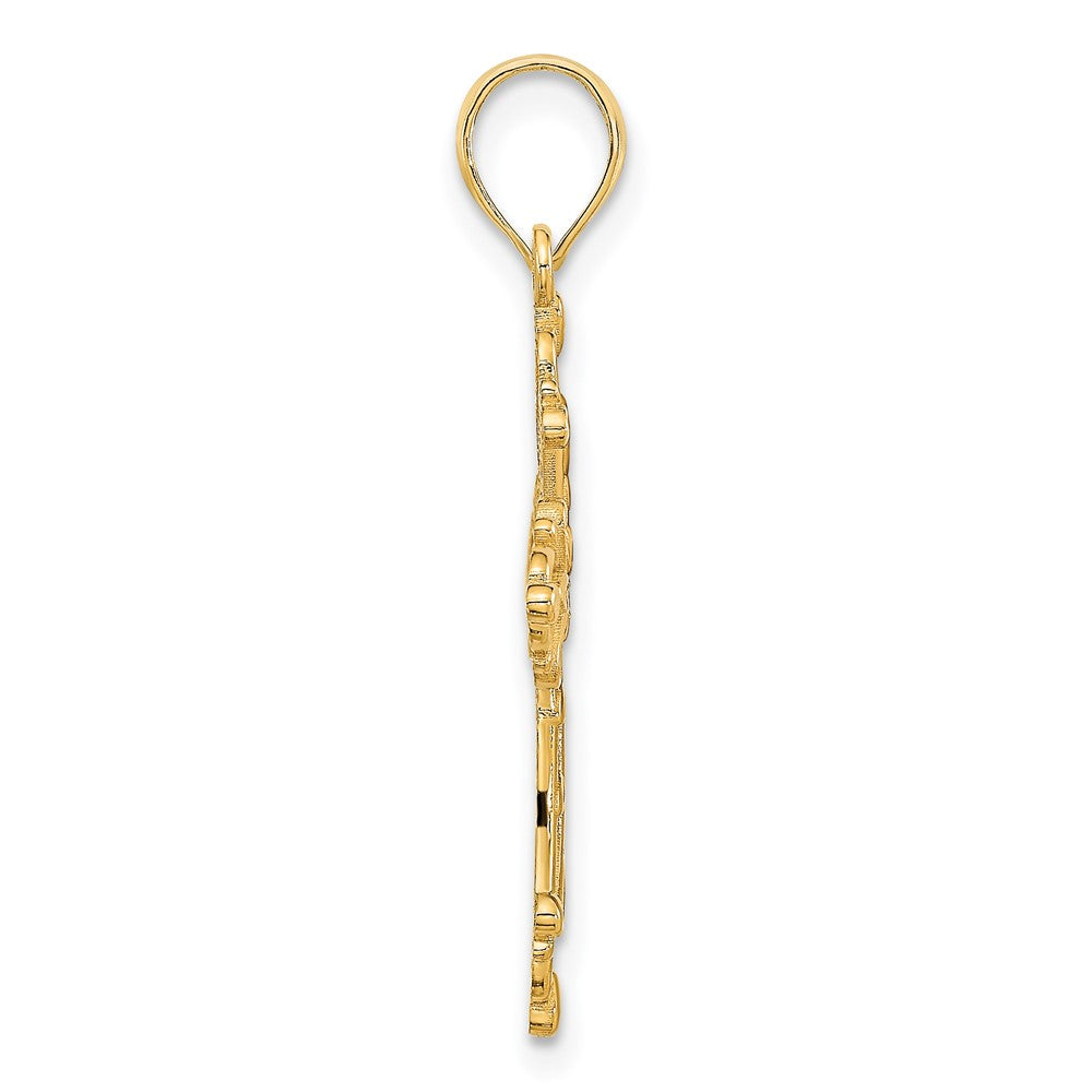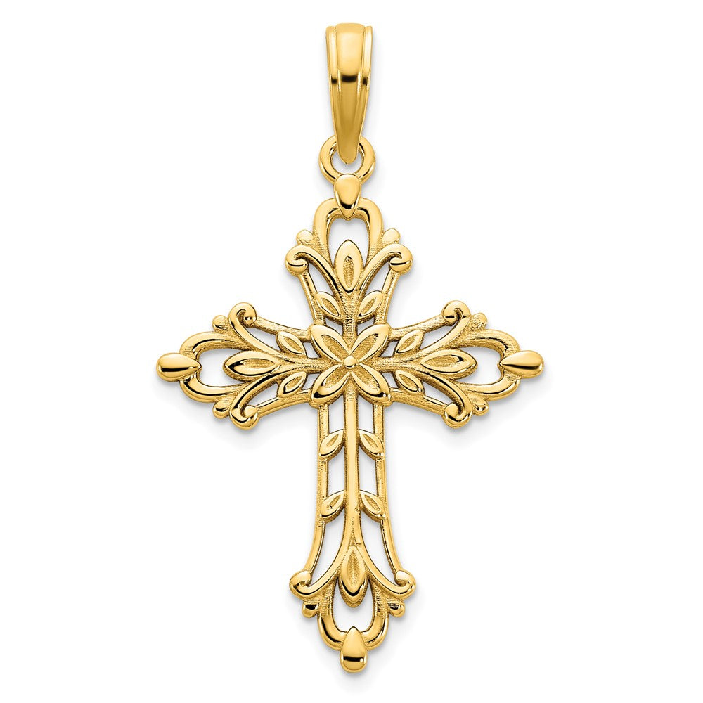 Add a touch of elegance and spirituality with this beautiful '14k Yellow Gold Fancy Cross Charm'. Made from premium 14k yellow gold, this charm exudes a lovely polished finish and has a weight of 1.36 grams, making it a truly precious piece. The charm measures 30mm in length, while the cross element measures 25.7mm in length, 1mm in thickness, and 18mm in width. It has a diamond-cut texture and a textured back, which adds depth and dimension to the design. This unisex charm comes with a 6mm bail length and is sold individually. Its coveted themed pendant/charm style is perfect for all occasions and makes a great addition to any jewelry collection.