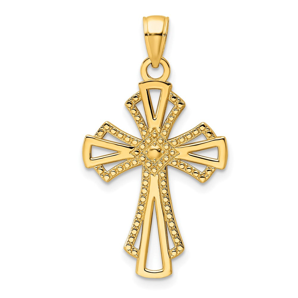 The '14k Yellow Gold Polished Beaded Cross Pendant' is a stunning piece of jewelry that is made from high-quality 14k yellow gold. Weighing 2.13 grams, this pendant has a length...