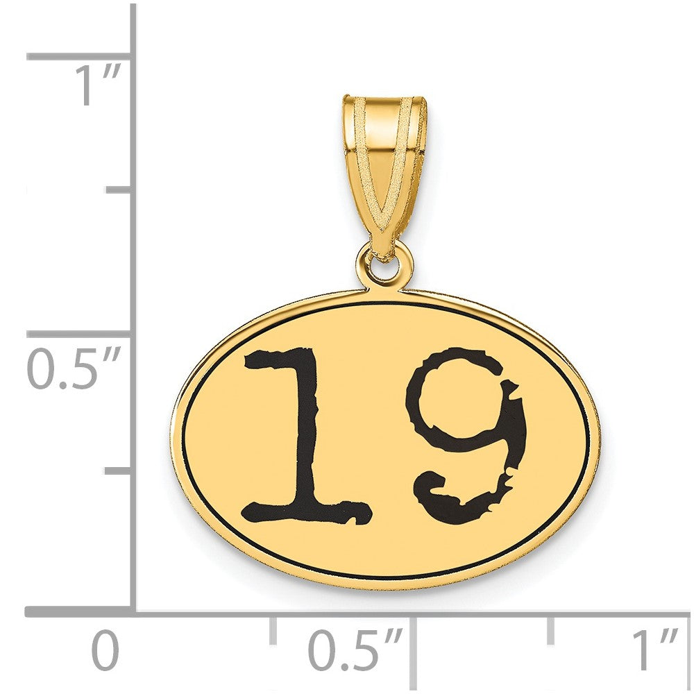 The '14k Yellow Gold Polished Number 19 Black Enamel Oval Pendant' is a stunning piece of jewelry made from high-quality 14k yellow gold. It weighs 1.86 grams and has a...