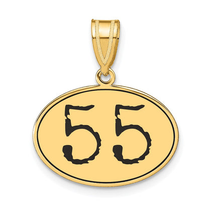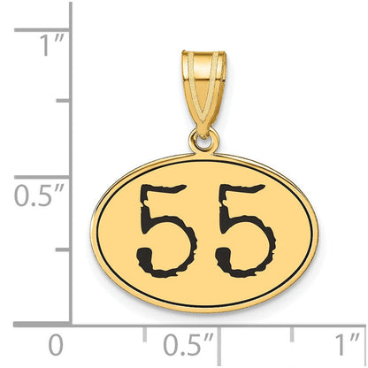 This piece of jewelry is a 14k yellow gold polished pendant in the shape of an oval. The pendant features the number 55 in black enamel, adding a unique touch...