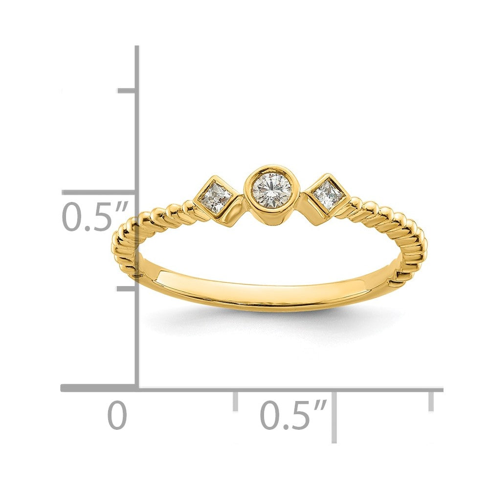 Introducing the stunning 14k Scalloped Band Petite 3-Stone Round Diamond Promise/Engagement Ring. This exquisite ring features a sleek polished finish and showcases brilliant round diamonds, all set in a classic bezel style. Each stone sparkles with a dazzling I1 clarity, making it perfect for expressing your love. Crafted with solid 14K yellow gold, its elegant taper and fine details create a timeless look. The 3-stone design symbolizes your past, present, and future together. The 14k Scalloped Band Petite 3-Stone Round Diamond ring is your ideal choice for a heartfelt promise or engagement.