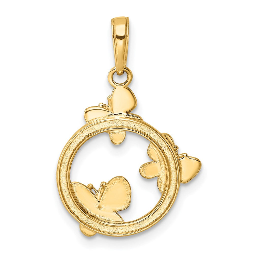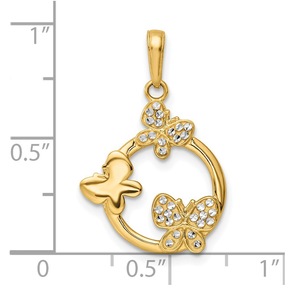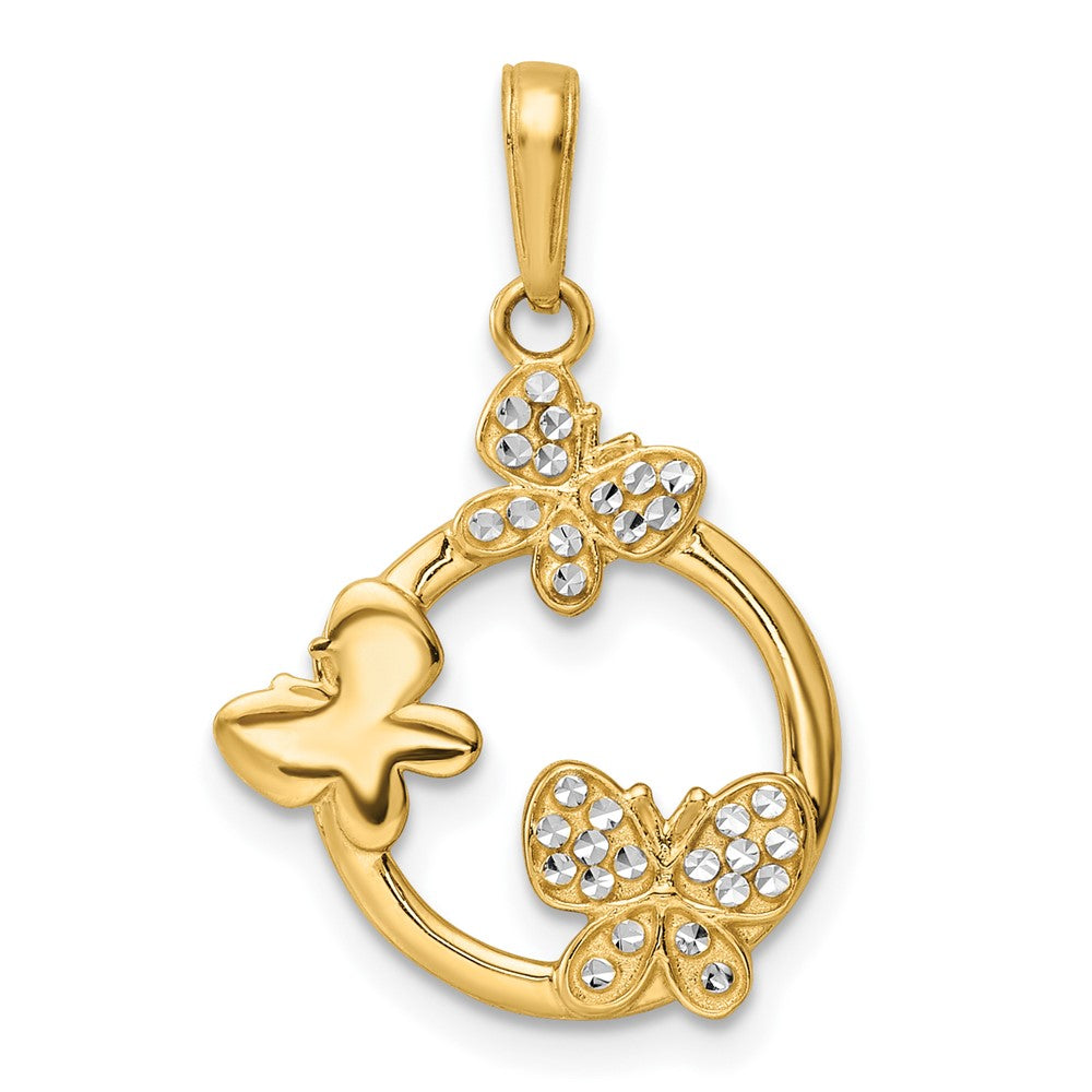 The primary color of this pendant is yellow, giving it a classic and timeless style that will never go out of fashion. If you're looking for a high-quality piece of jewelry that is both beautiful and versatile, then this '14k Yellow & Rhodium Gold and White Rhodium Diamond-cut Butterflies on Circle Pendant' is the perfect choice for you.