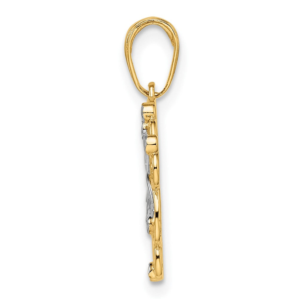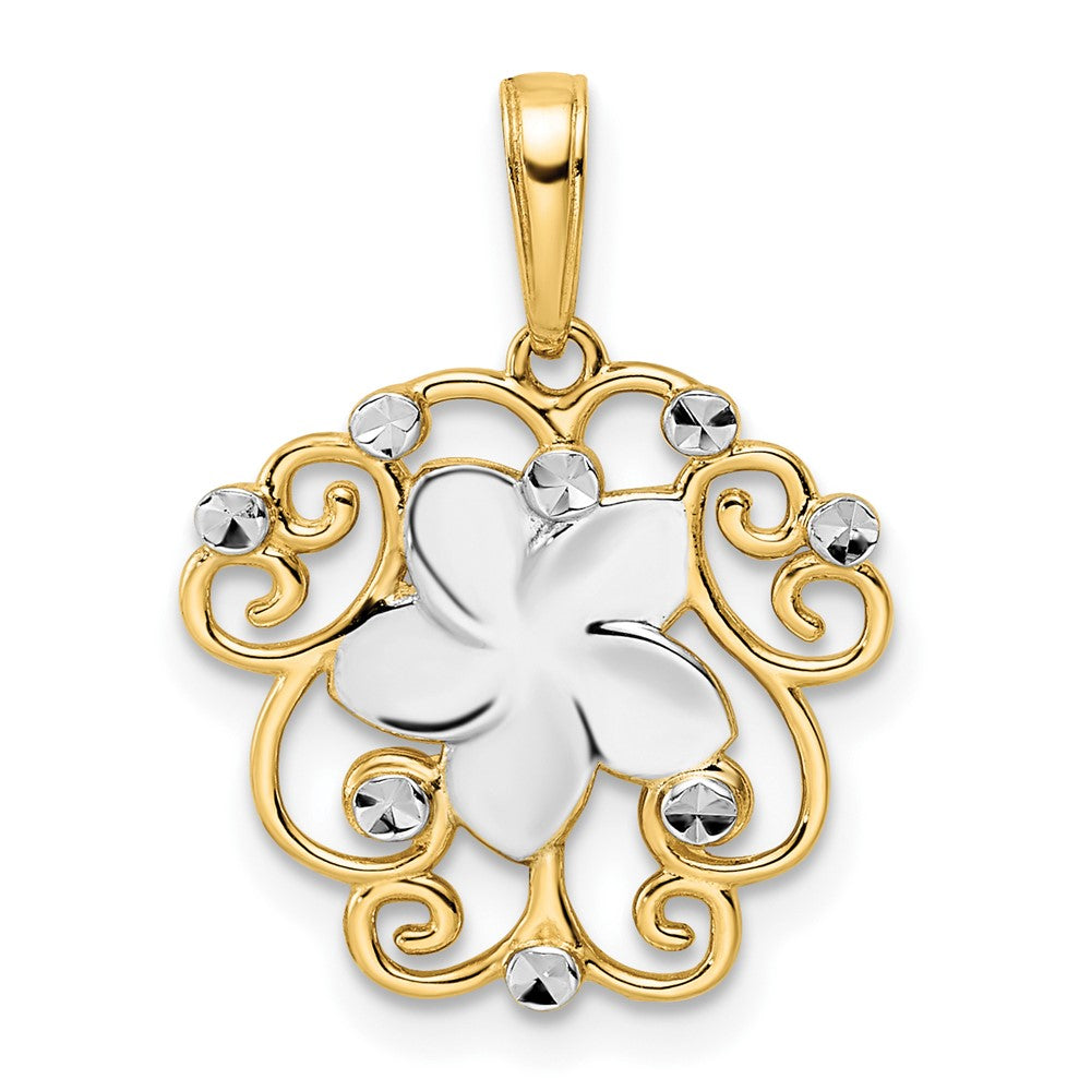 This beautiful pendant is crafted from 14k yellow and rhodium gold, and features intricate diamond-cut floral detailing. The design is accented with white rhodium, adding contrast and sophistication. With a weight of 1.37 grams, this pendant is solidly constructed and measures 21.67mm in length and 16.91 mm in width. The charming design is meant to be worn on a chain and has a bail width of 4.59 mm and a bail length of 6.8 mm. This pendant is sold individually, and is a perfect addition to any jewelry collection.