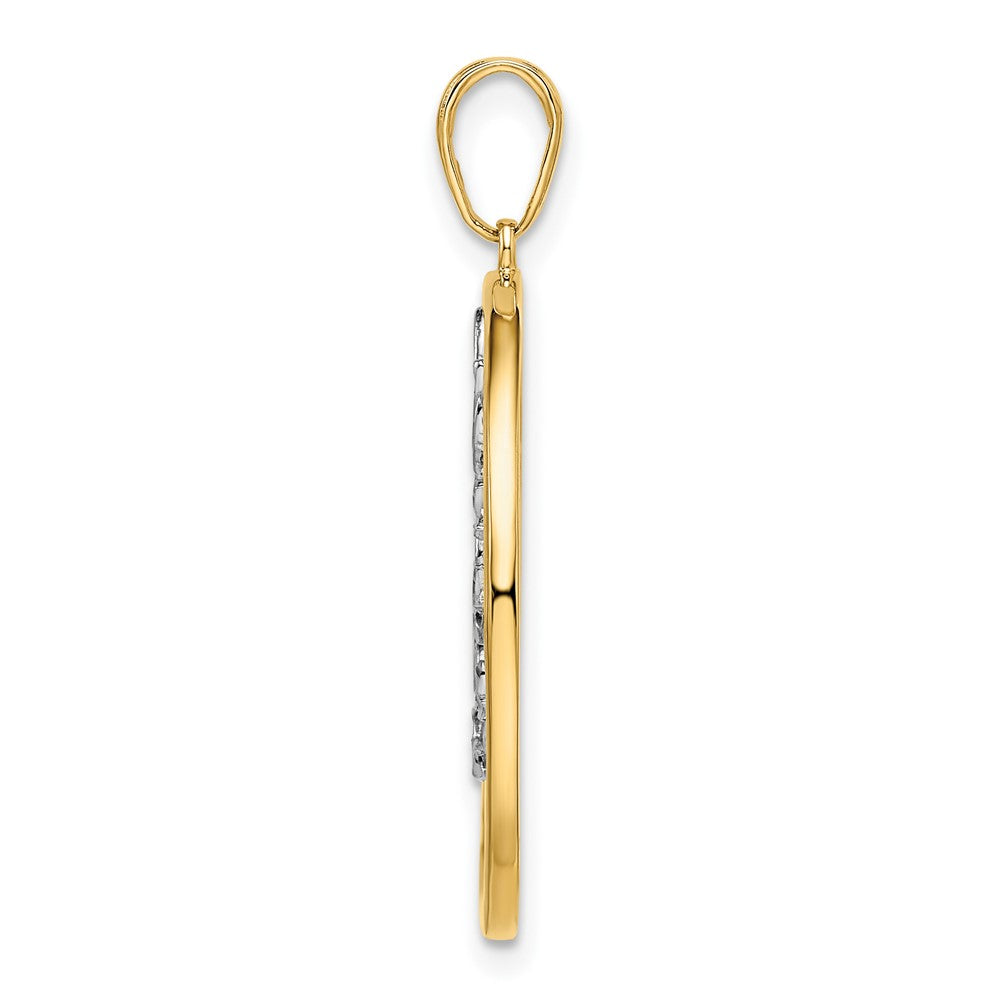 Enjoy the unique beauty of this stunning '14k Yellow & Rhodium Gold and White Rhodium Diamond-cut Tree of Life Pendant'. Made with precious 14k yellow and rhodium gold, this pendant weighs 3.74 GM. The polished finish of this pendant adds to its overall shine, and the white rhodium accents further highlights the gorgeous tree of life design. The pendant measures 31.67 mm in length, with a charm/element length of 25.89 mm and width of 24.22 mm, and thickness of 1.61 mm. This solidly crafted pendant is created using casting techniques and is not recommended for engraving. Perfect as a jewelry piece or a thoughtful gift, this pendant is sold by unit and comes with a flat back profile, diamond-cut texture, and a bail width of 4.56 mm, with a bail length of 6.67 mm. Add a touch of nature-inspired elegance to your look with this '14k Yellow & Rhodium Gold and White Rhodium Diamond-cut Tree of Life Pendant'.