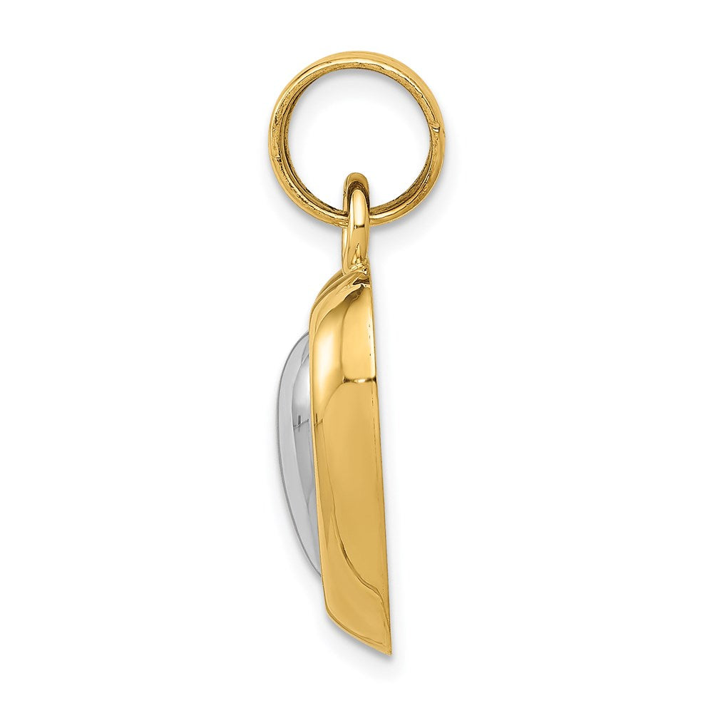 This stunning pendant is crafted from 14k yellow and rhodium gold, with a sleek white rhodium polished heart at its center. With a weight of 2.5 grams and a length of 28mm, this piece is both lightweight and elegant. The pendant features a hollow center and is made using a die struck manufacturing process. It measures 17mm in width and is designed to be sold as a single unit. This piece is perfect for those who love themed jewelry and showcases a beautiful two-tone gold color that is sure to catch the eye.