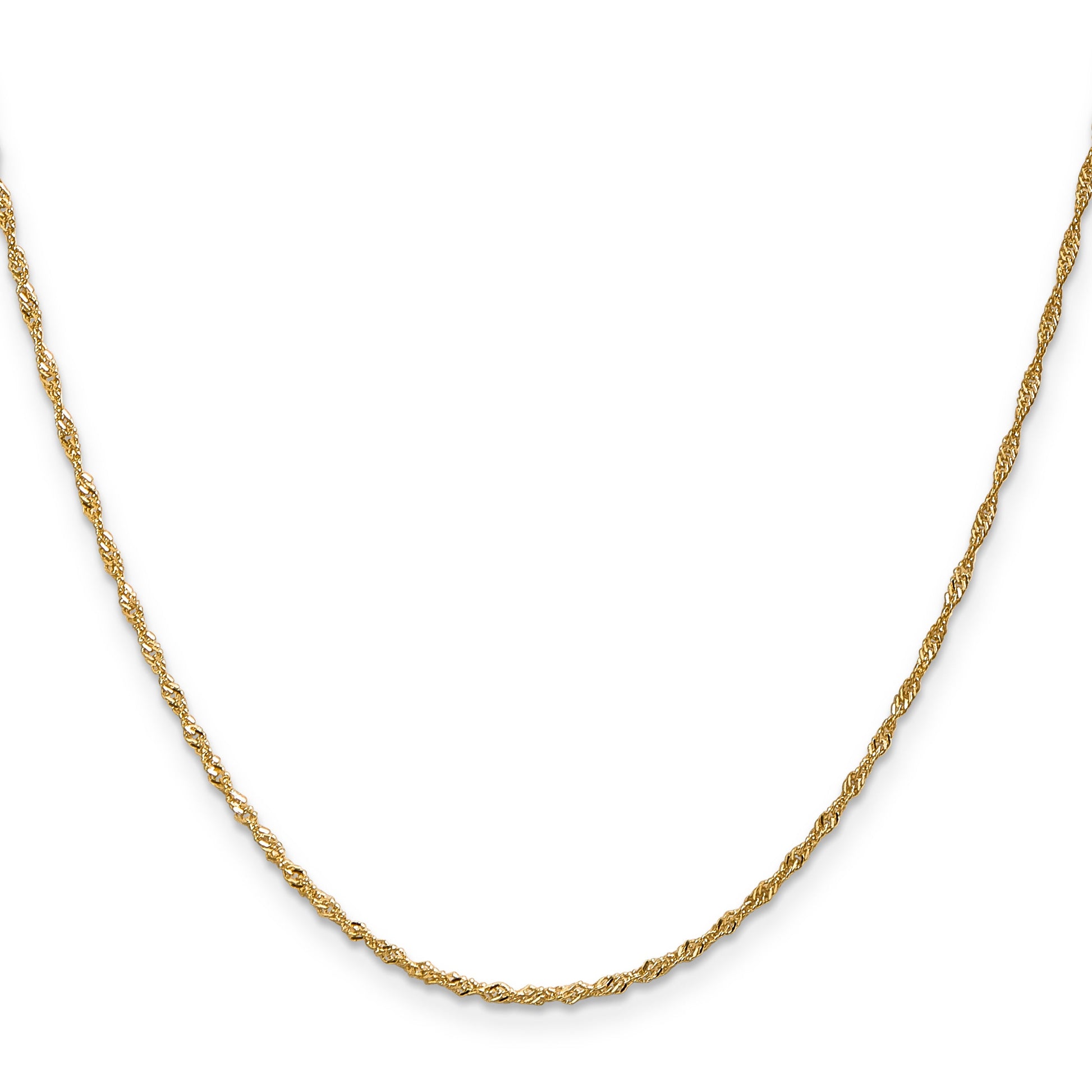 Introducing the elegant 18 Inch 14K 1.3mm Singapore Chain, a spectacular blend of style and durability. Made from high-quality 14K yellow gold, this polished chain radiates a timeless shine. The intricate Singapore design, sized at a delicate 1.3mm, offers both beauty and strength. Fastened securely with a lobster clasp, it ensures easy wear and confident hold. Plus, this necklace is nickel-free, making it perfect for sensitive skin. Machine made and backed by a lifetime guarantee, the 18 Inch 14K 1.3mm Singapore Chain is a stunning, reliable addition to any jewelry collection.