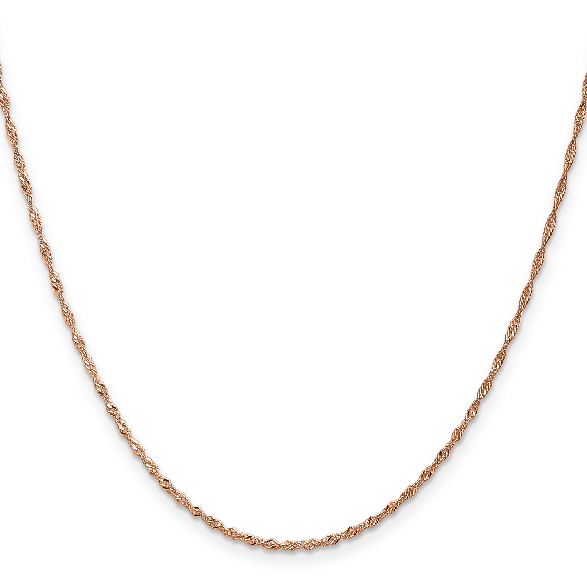 The 18 Inch 14K Rose Gold 1mm Singapore Chain with Lobster Clasp epitomizes elegance. Crafted from polished, solid 14K rose gold, this chain boasts a refined 1mm width. Its lustrous Singapore design offers a stunning twist to your jewelry collection. The durable lobster clasp ensures a secure fit, perfect for everyday wear or special occasions. Nickel-free and machine-made, it comes with a lifetime guarantee, promising lasting quality. Make the 18 Inch 14K Rose Gold 1mm Singapore Chain a cherished part of your collection, radiating timeless beauty.