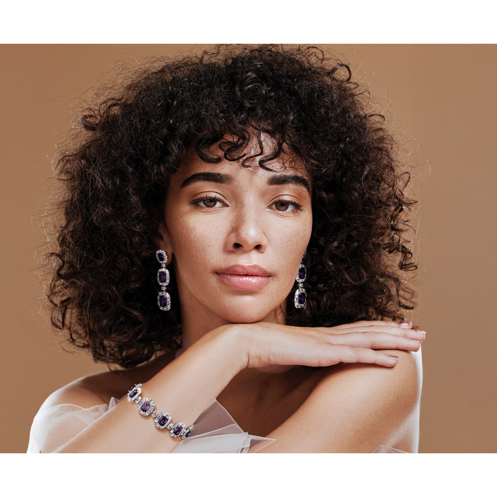 Introducing the Cheryl M Sterling Silver Rhodium-plated Polished Fancy Purple and White CZ Halo Cluster Bracelet. This stunning bracelet features a blend of brilliant purple and white cubic zirconia stones, forming a dazzling halo cluster. The polished finish glistens beautifully, making it perfect for both casual and formal outfits. Crafted from high-quality 925 sterling silver, it also includes a secure safety chain that ensures you can wear it with ease. Elevate your jewelry collection with the Cheryl M Sterling Silver Rhodium-plated Polished Fancy Purple and White CZ Halo Cluster Bracelet.