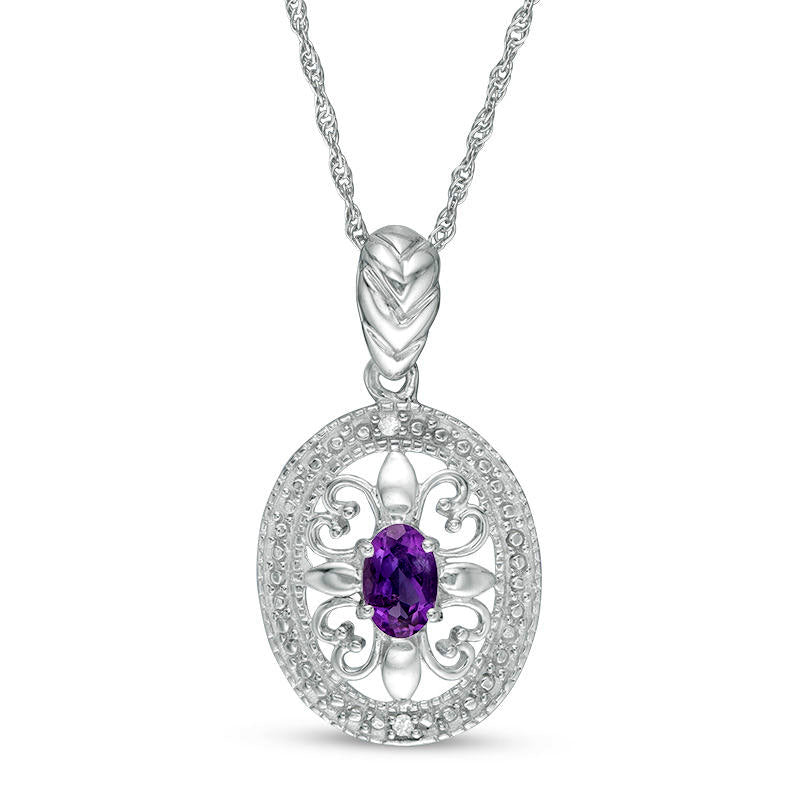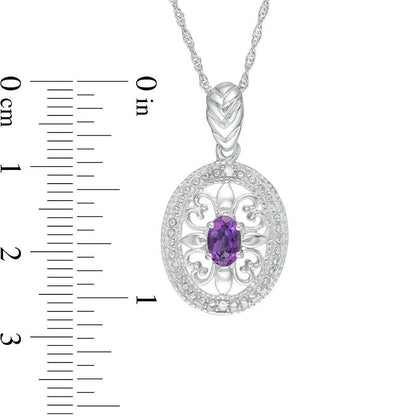 Oval Amethyst and Natural Diamond Accent Heart Antique Vintage-Style Pendant in Sterling Silver