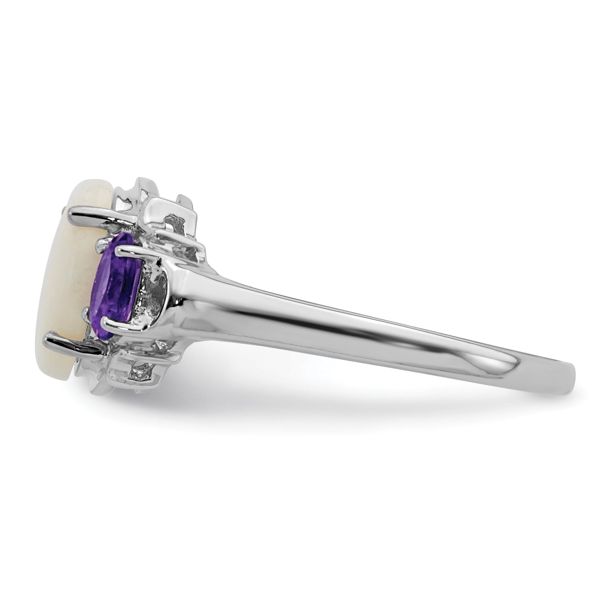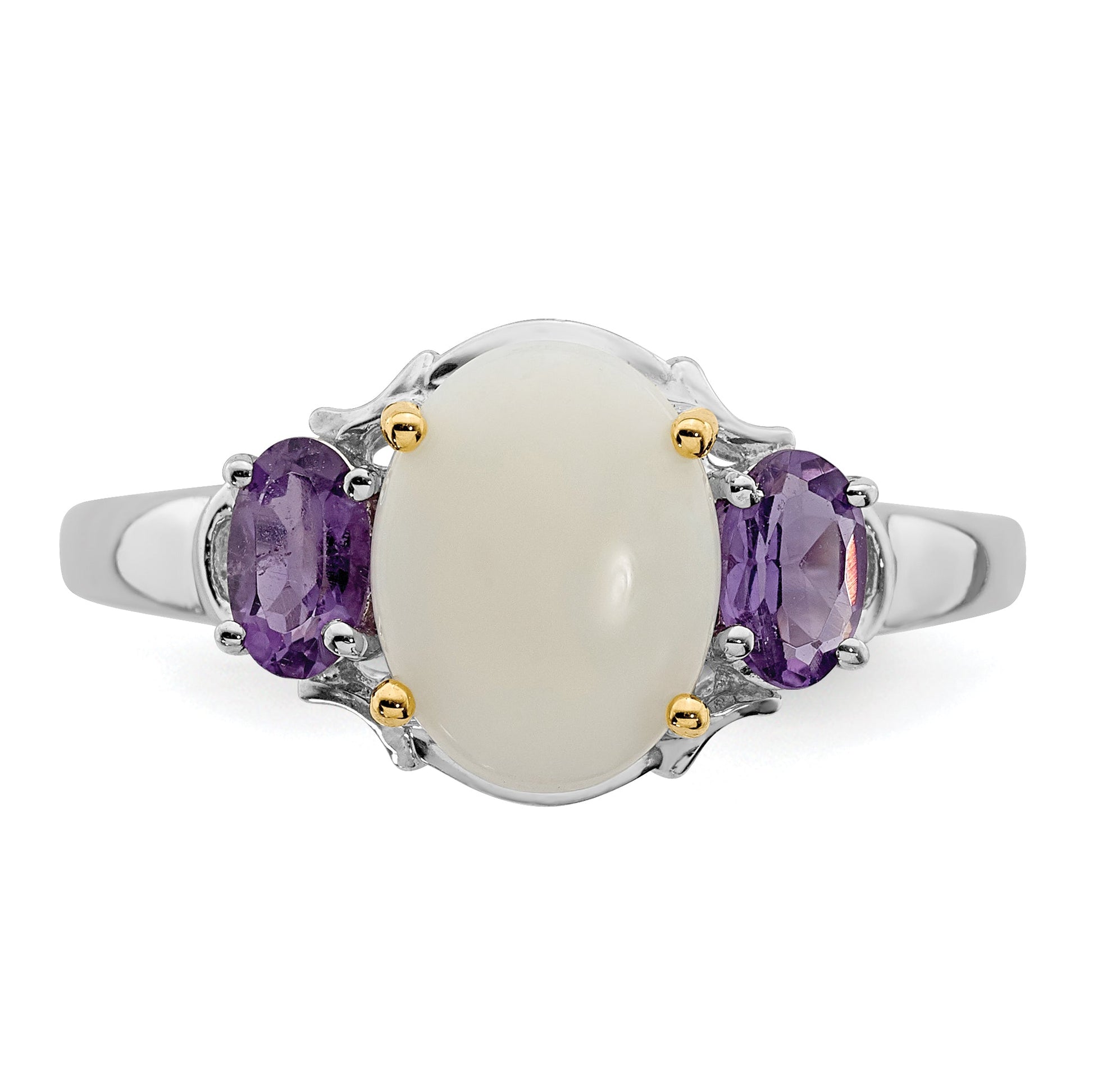 The Sterling Silver Brilliant Gemstones with 14K Accent Rhodium-Plated Opal and Amethyst Ring perfectly captures elegance in a simple design. It features two dazzling amethysts in rich purple and a stunning Phenomena Opal, all set in the polished sterling silver band. The ring’s tapered width adds a touch of modern flair, while its natural stones offer a unique, mesmerizing look. With a sleek silver tone finish and delicate 14K gold accents, the Sterling Silver Brilliant Gemstones with 14K Accent Rhodium-Plated Opal and Amethyst Ring brings a fresh vibe to any style.