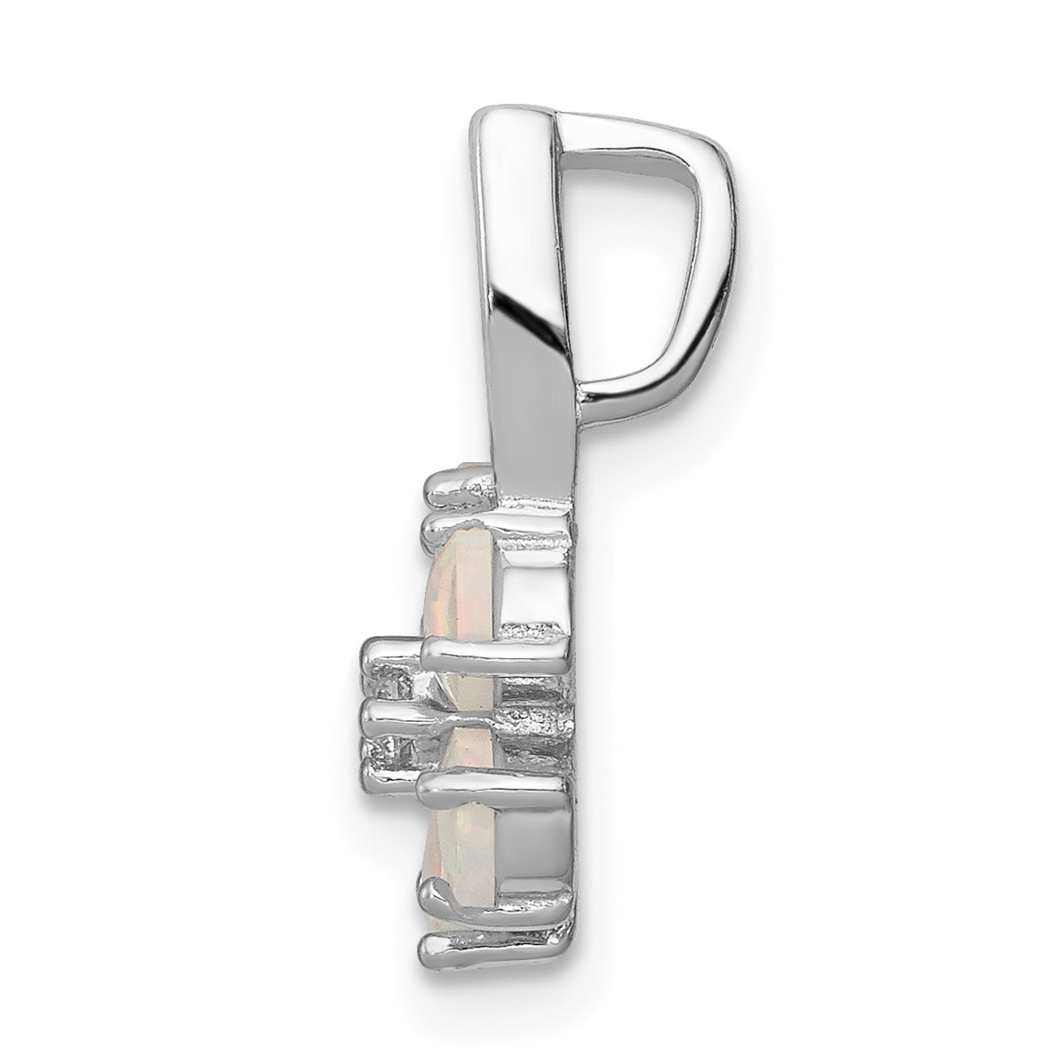 Discover the enchanting Sterling Silver Rhodium Plated Opal Flower Pendant, a masterpiece that captures elegance and charm. This exquisite pendant features shimmering lab-created opals, displaying a mesmerizing play-of-color. Cubic Zirconia stones add brilliant white accents to the design, enhancing its grace. The piece boasts a polished finish on 925 sterling silver, with rhodium plating for a sleek silver tone. This flower pendant measures 19mm in length and 10mm in width, perfect for any occasion. Ideal for October birthdays, this stunning pendant adds a timeless touch to your jewelry collection.