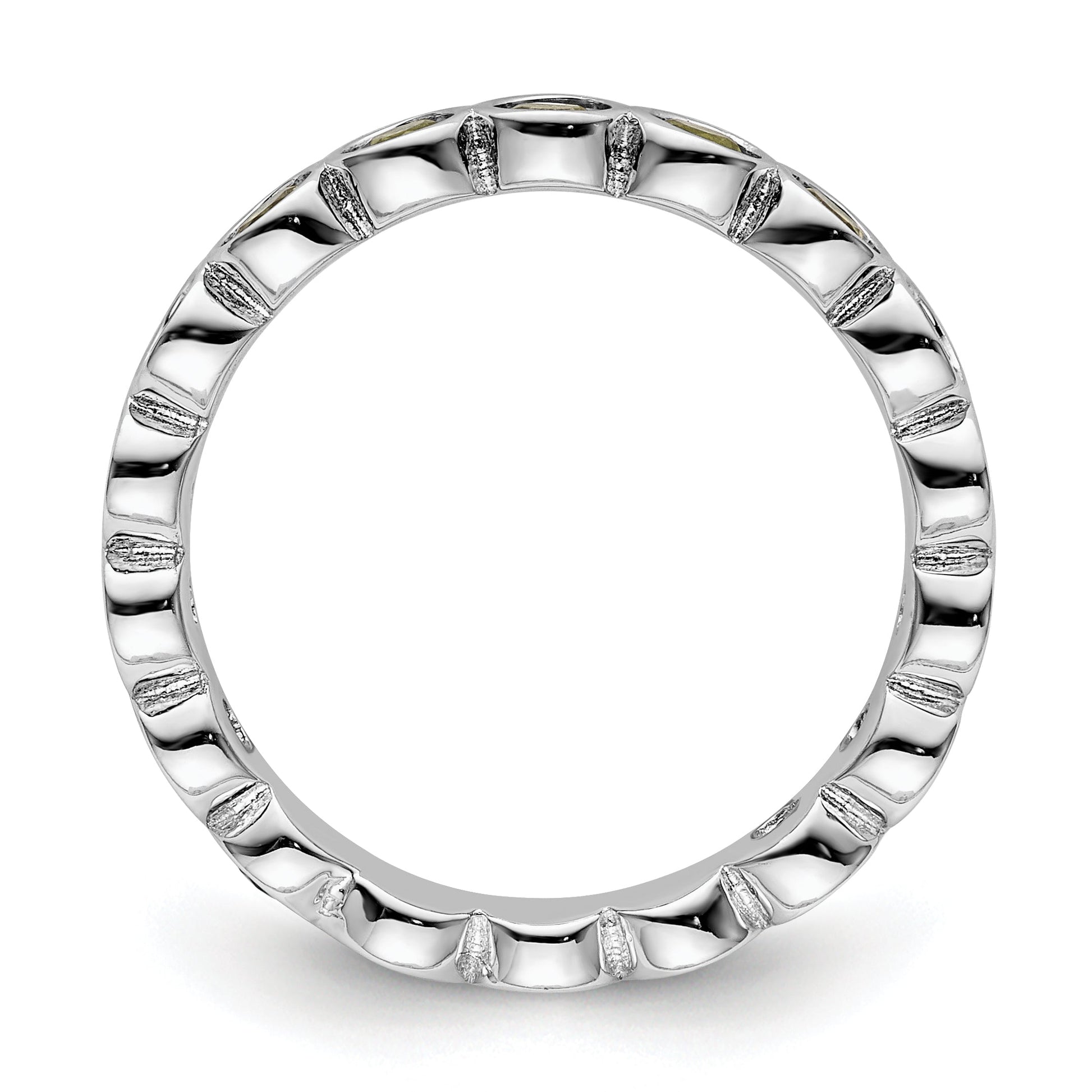 The Sterling Silver Stackable Expressions Peridot Ring is a stylish piece that adds a pop of color to your look. Crafted from high-quality 925 sterling silver, it features a bright polished finish. The ring showcases 20 natural round Peridot stones, each 2.5 mm wide, bezel-set to ensure they stay secure. With a band width of just 3.5 mm, it’s perfect for stacking or wearing alone. The green stones bring a lively touch, making this ring ideal for daily wear or special occasions. The Sterling Silver Stackable Expressions Peridot Ring combines beauty and durability for a timeless look.