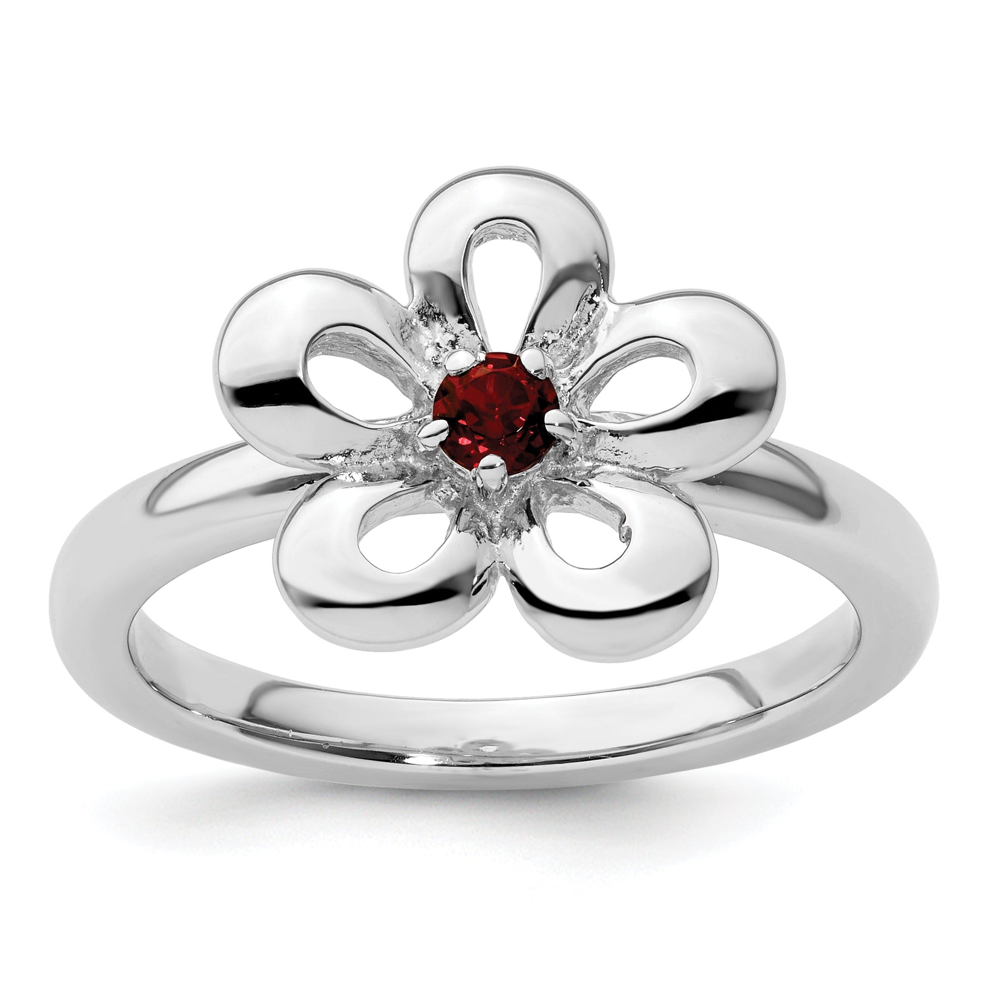 Introducing the Sterling Silver Stackable Expressions Polished Garnet Flower Ring, a fresh take on jewelry that makes a statement. Crafted from high-quality 925 sterling silver, this ring boasts a sleek, polished finish. It showcases a vibrant, round garnet stone set in a prong setting, which adds a pop of rich red color. The 2.25 mm band is light yet sturdy, perfect for stacking with other rings or wearing solo. Designed with a cast method, this solid piece features a natural, not enhanced stone and a timeless flower motif. The Sterling Silver Stackable Expressions Polished Garnet Flower Ring combines style and quality for everyday wear or special moments.