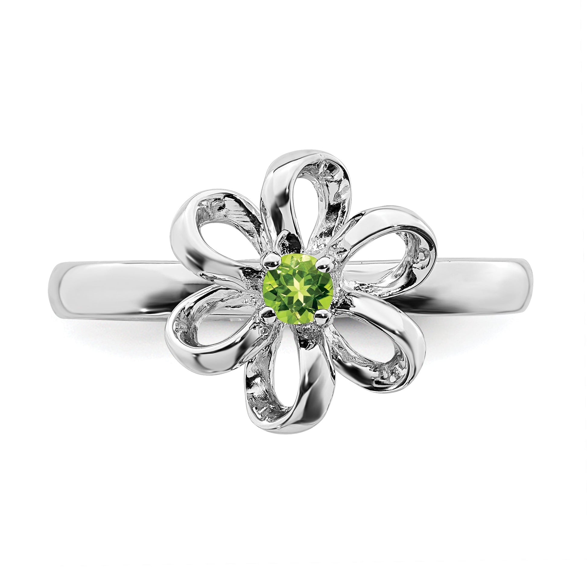 The Sterling Silver Stackable Expressions Polished Peridot Flower Ring is a bold yet elegant accent for any jewelry collection. Crafted from 925 sterling silver with a bright rhodium finish, this ring features a vibrant green peridot stone that catches the eye. The flower design adds a charming touch, making it a perfect piece to wear alone or stack with other rings. Its solid cast build ensures durability, while the prong setting secures the 3mm round stone tightly. Whether as a gift or for yourself, the Sterling Silver Stackable Expressions Peridot Flower Ring offers style and quality in one beautiful package.