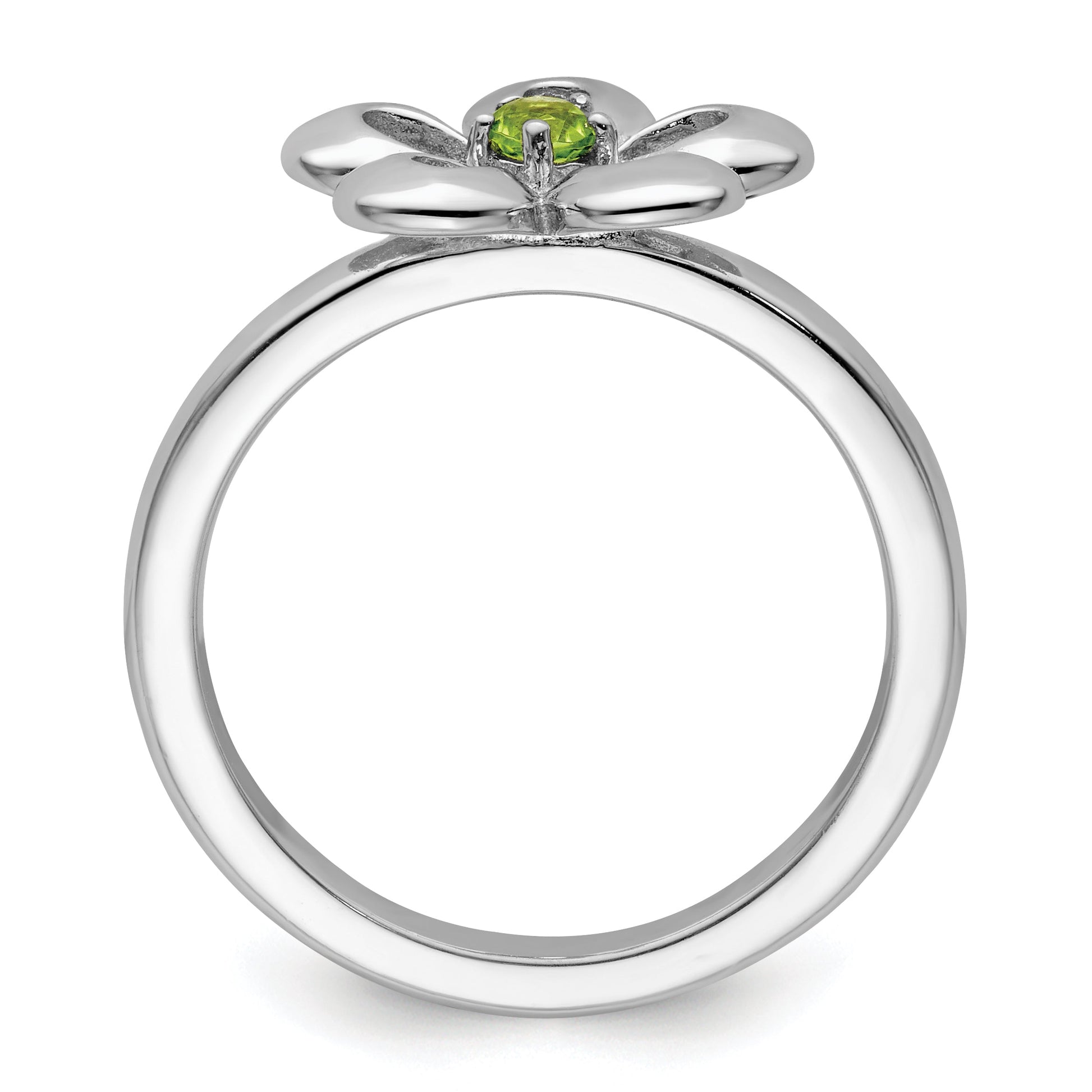 The Sterling Silver Stackable Expressions Polished Peridot Flower Ring adds a bright touch to your look. Crafted from pure 925 sterling silver, it features a vibrant green Peridot stone, set in a pretty flower shape. The ring is polished for a smooth finish and uses rhodium plating to prevent tarnish. With a 2.25 mm band and a 3 mm round stone, it offers a subtle yet eye-catching charm. Perfect for stacking or wearing alone, this birthstone ring is a natural treasure that brings a fresh pop of color. The Sterling Silver Stackable Expressions Polished Peridot Flower Ring is a timeless piece for everyday wear.